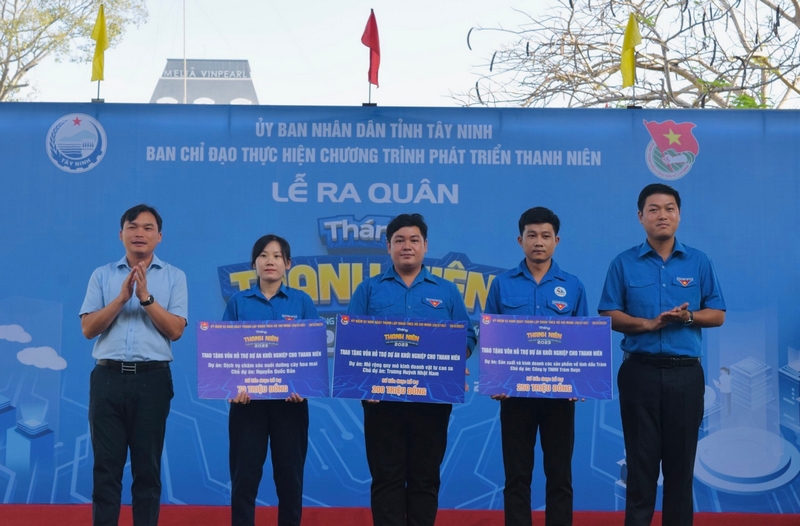Hưởng ứng Tháng Thanh niên năm 2023 với chủ đề “Tuổi trẻ Tây Ninh vững tin tiến bước, xung kích chuyển đổi số” tại Lễ ra quân Ban Thường vụ Tỉnh đoàn đã tổ chức trao tặng bảng tượng trưng công trình “Thắp sáng đường tuần tra biên giới” trị giá 100 triệu đồng; trao 100 suất học bổng khóa học Tiếng Anh giao tiếp cho các em học sinh trị giá 110 triệu đồng; trao tặng học bổng “Thắp sáng ước mơ” trị giá 200 triệu đồng; trao Quỹ học bổng Kiều Phan hỗ trợ, giúp đỡ các bạn đoàn viên, thanh thiếu nhi Tây Ninh có hoàn cảnh khó khăn với số tiền 120 triệu đồng. Bên cạnh đó, nhằm hỗ trợ, tạo động lực cho các bạn trẻ vươn lên phát triển kinh tế, trong dịp này Ban Thường vụ Tỉnh đoàn đã tổ chức trao vốn hỗ trợ cho 03 dự án khởi nghiệp của Thanh niên với tổng giá trị 520 triệu đồng.