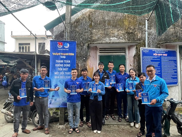 Đội hình thanh niên tình nguyện hỗ trợ người dân thực hiện mô hình “Thanh toán không dùng tiền mặt”