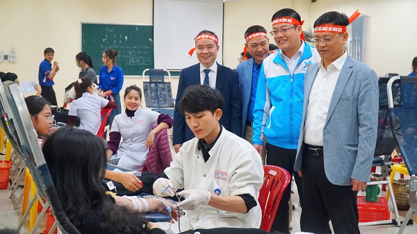 Các đồng chí lãnh đạo động viên các bạn đoàn viên, thanh niên tham gia hiến máu tình nguyện