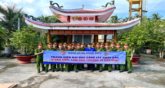 Với phương châm đó, năm 2022, trường Đại học cảnh sát nhân dân tổ chức đợt “ Hành quân xanh” cho lực lượng trẻ học viên công an về các xã huyện Gò Công Tây, tỉnh Tiền Giang cùng lực lượng đoàn thanh niên, công an địa phương làm công tác giúp dân, tham gia bảo vệ an ninh, trật tự an toàn xã hội. Những chiến sĩ cảnh sát trẻ hăm hở lên đường làm công tác giúp dân bằng sự nhiệt thành của tuổi trẻ, bằng phẩm chất, năng lực người chiến sĩ Cảnh sát nhân dân, bằng việc vận dụng Sáu điều Bác Hồ dạy: “Công an của ta là Công an Nhân dân, vì dân mà phục vụ và dựa vào Nhân dân mà làm việc” tham gia các phong trào tình nguyện, thiện nguyện, đền ơn đáp nghĩa,... với mục tiêu vì nhân dân phục vụ.