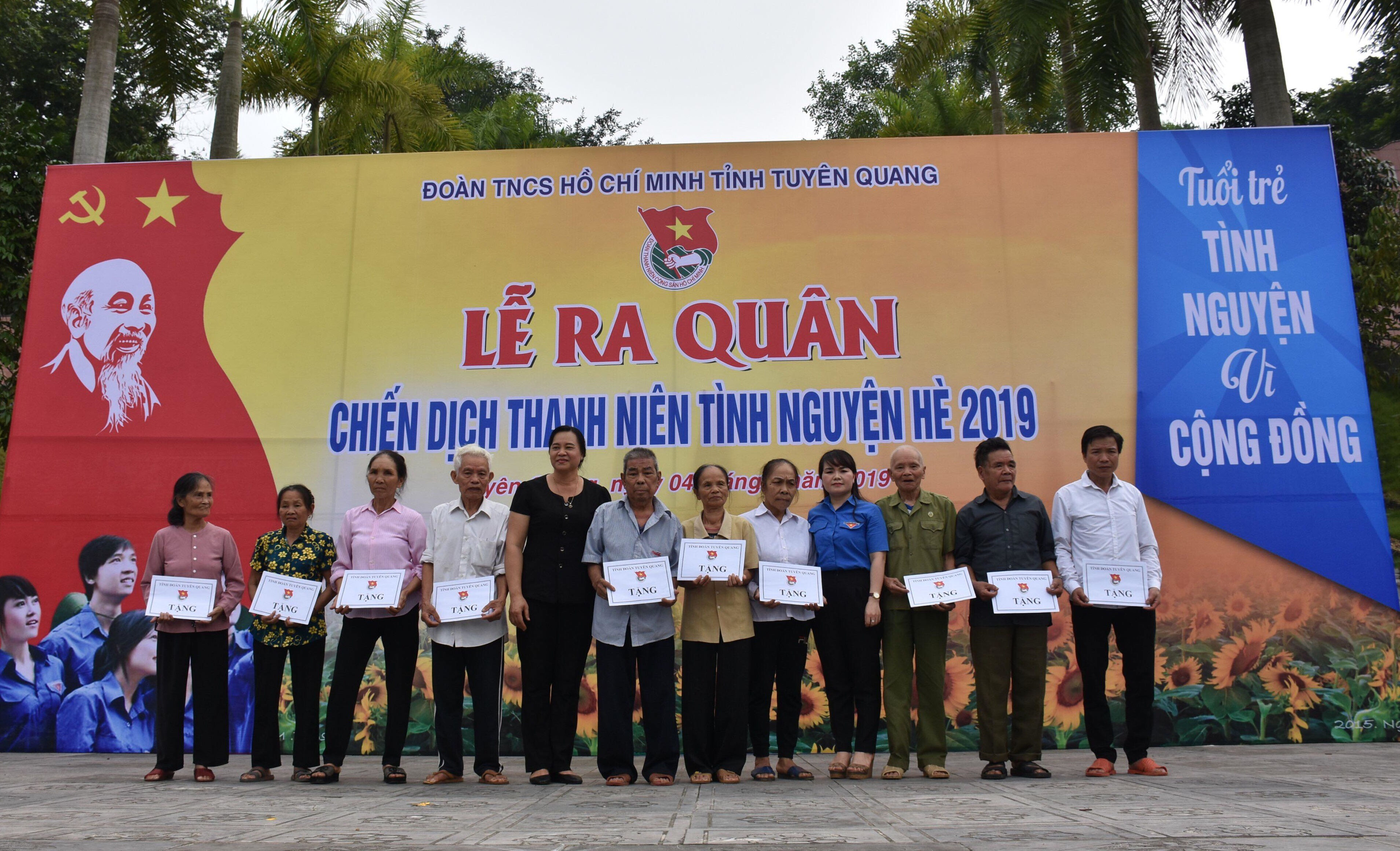 Nhân dịp này, Ban Thường vụ Tỉnh đoàn đã tặng 10 suất quà dành cho 10 hộ gia đình chính sách, gia đình có hoàn cảnh đặc biệt khó khăn trên địa bàn xã Minh Thanh, huyện Sơn Dương, mỗi suất trị giá 500.000 đồng; tặng 10 suất học bổng dành cho 10 em học sinh có hoàn cảnh khó khăn vươn lên trong học tập, mỗi suất trị giá 500.000 đồng. Cũng tại buổi lễ, Ban Thường vụ Tỉnh đoàn đã trao vật phẩm “Tiếp sức mùa thi” cho đại diện các huyện, thành đoàn, Đoàn Khối các cơ quan tỉnh, Hội Sinh viên trường Đại học Tân Trào. Ban Thường vụ Huyện đoàn đã hỗ trợ 30 triệu đồng để xây dựng 02 phòng học Mầm non tại xã Cấp Tiến, huyện Sơn Dương từ nguồn xã hội hóa.