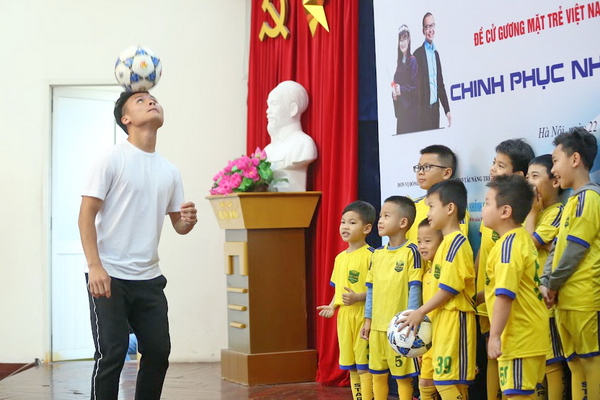 Quang Hải gặp gỡ và biểu diễn một số kỹ thuật bóng đá với các em thiếu nhi tại chương trình |