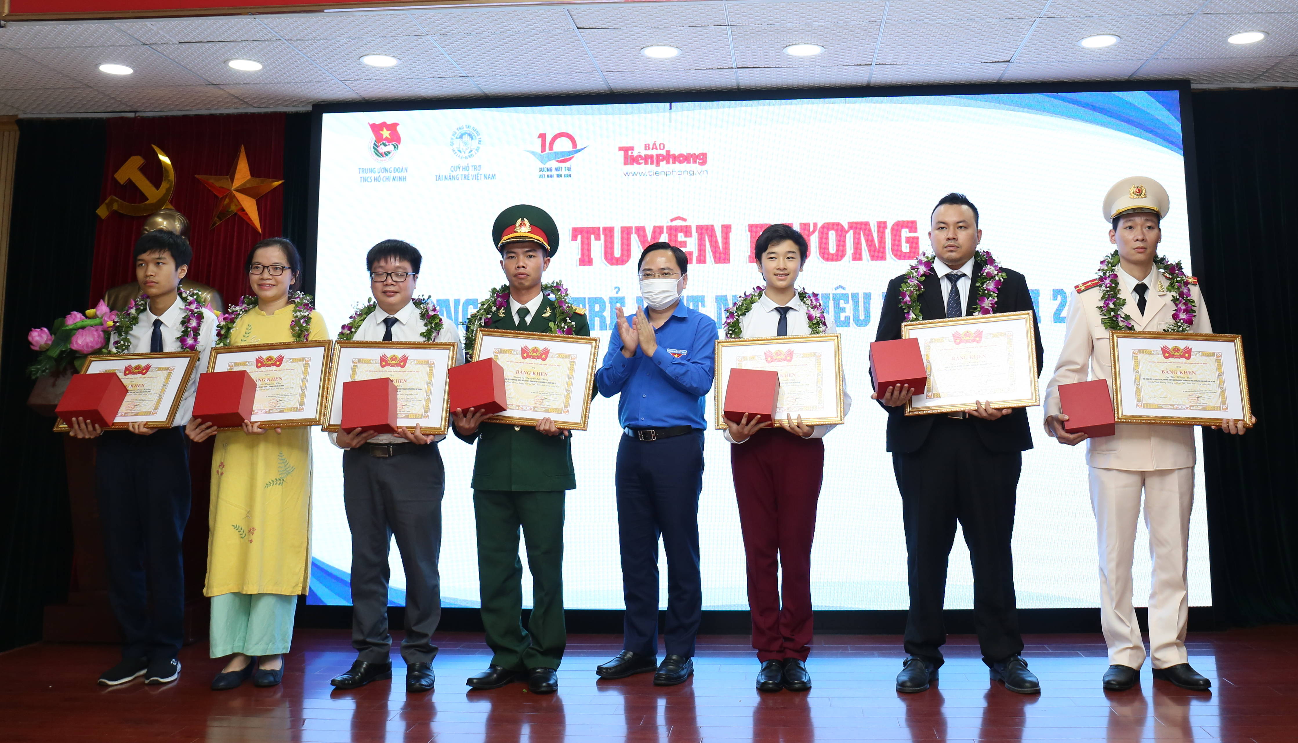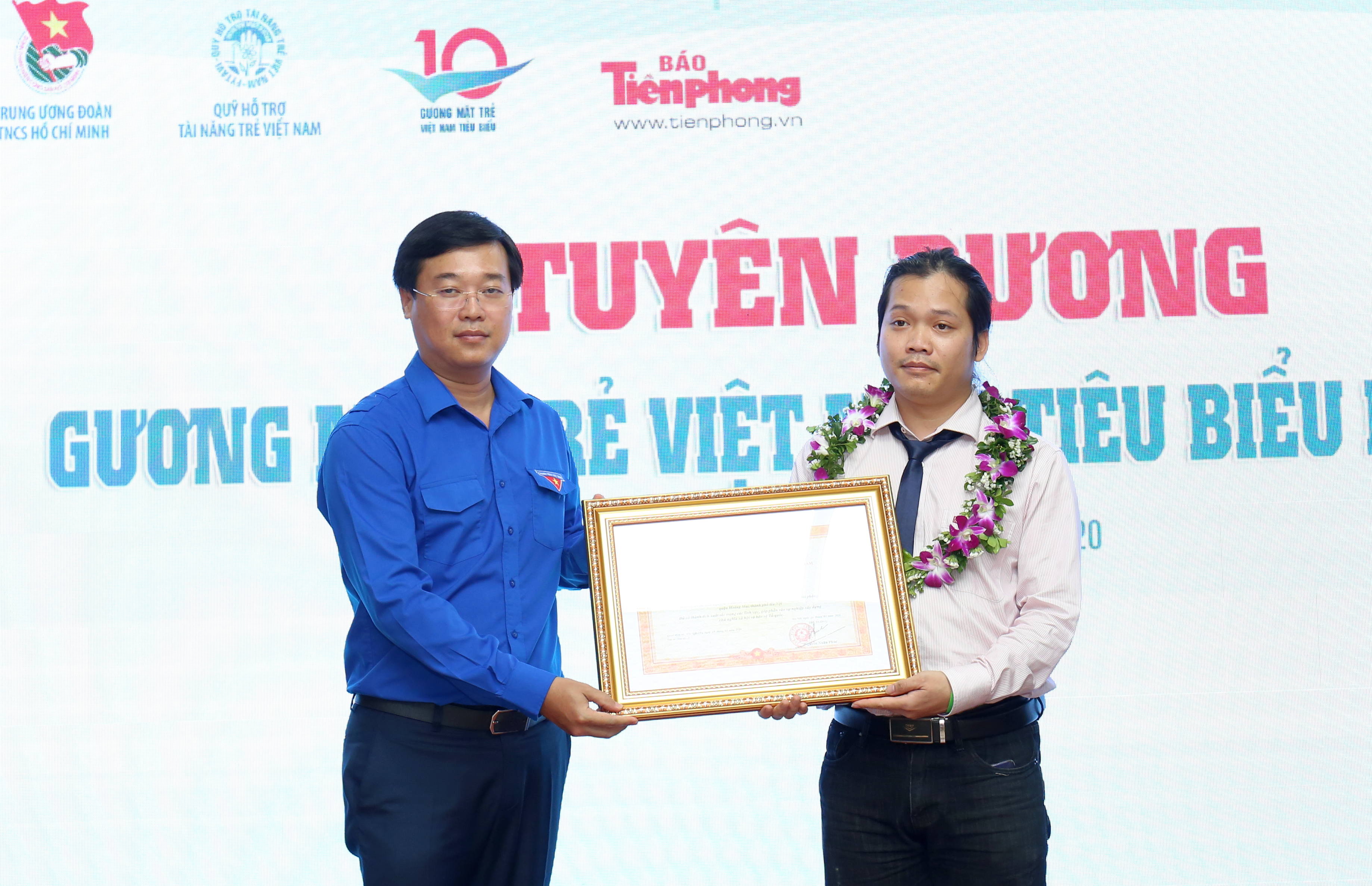 Đồng chí Nguyễn Anh Tuấn, Bí Thư Thường trực T.Ư Đoàn, trao Bằng khen của Trung ương Đoàn và kỷ niệm chương của Giải thưởng cho các Gương mặt trẻ Việt Nam triển vọng năm 2019.