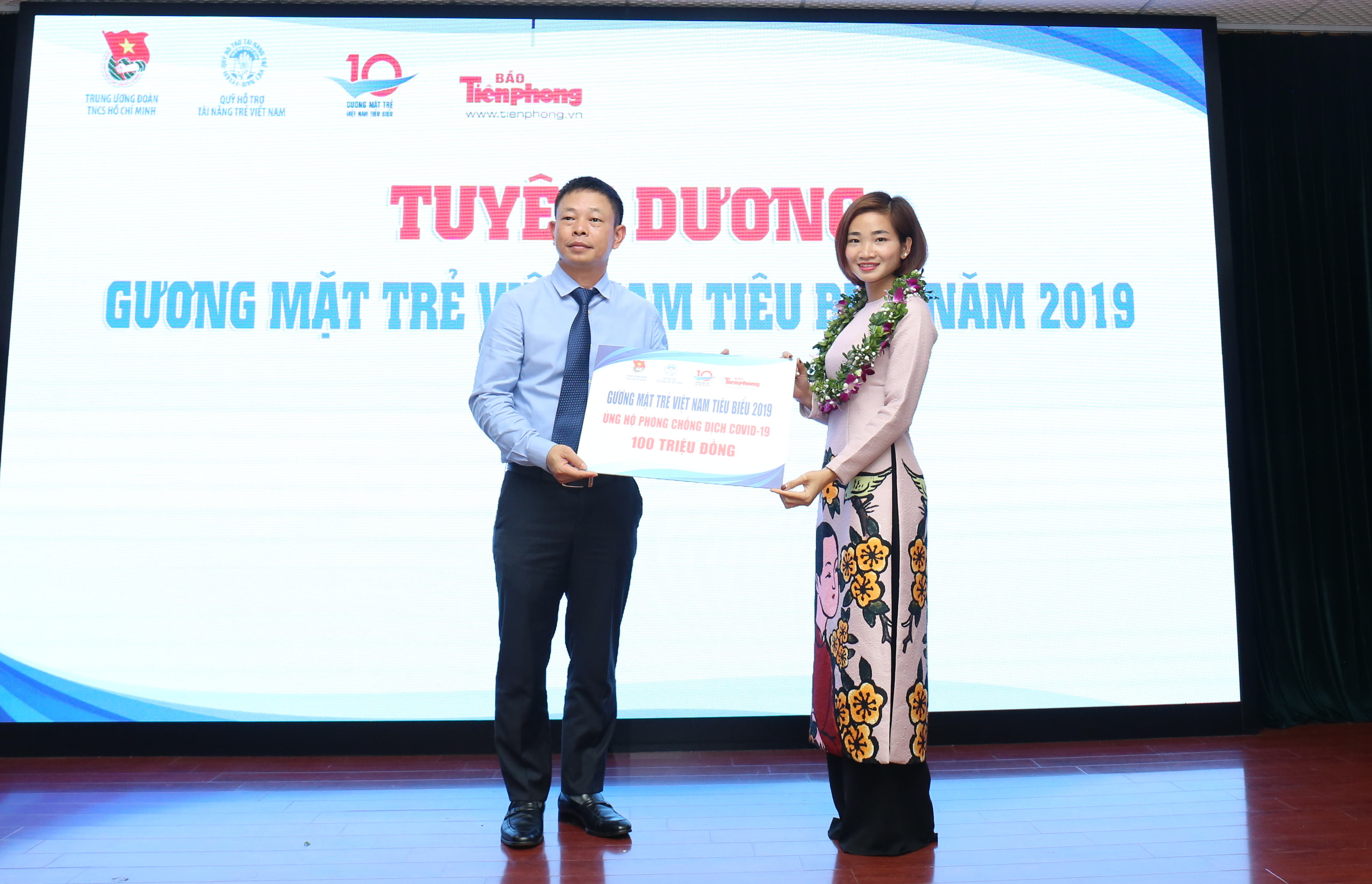 Nhà báo Phùng Công Sưởng, Phó Tổng biên tập báo Tiền Phong, Phó Giám đốc Qũy Hỗ trợ tài năng trẻ Việt Nam tiếp nhận số tiền ủng hộ chiến dịch phòng, chống dịch COVID-19 của đại diện Gương mặt trẻ Việt Nam tiêu biểu và triển vọng năm 2019.