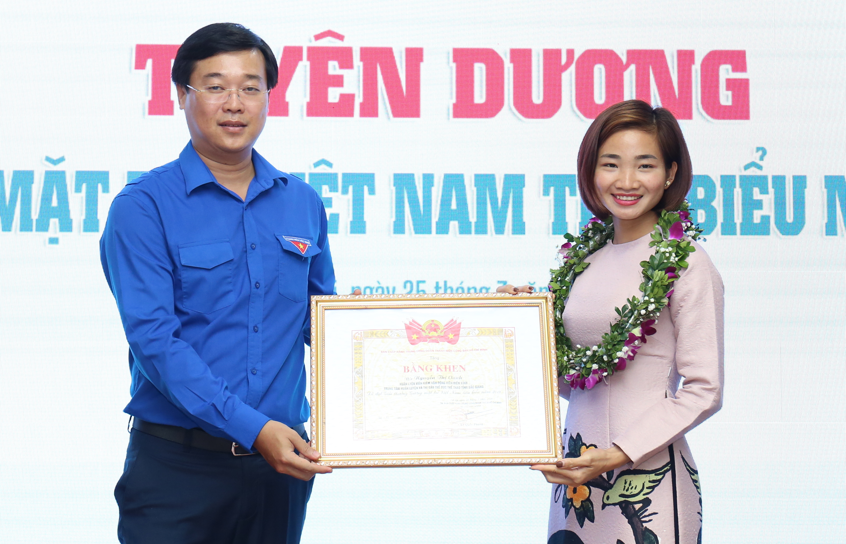 Đồng chí Lê Quốc Phong, Ủy viên dự khuyết BCH TƯ Đảng, Bí Thư thứ nhất T.Ư Đoàn, Chủ tịch Hội đồng xét tặng Giải thưởng trao Bằng khen của Thủ tướng Chính phủ cho vận động viên Nguyễn Thị Oanh.