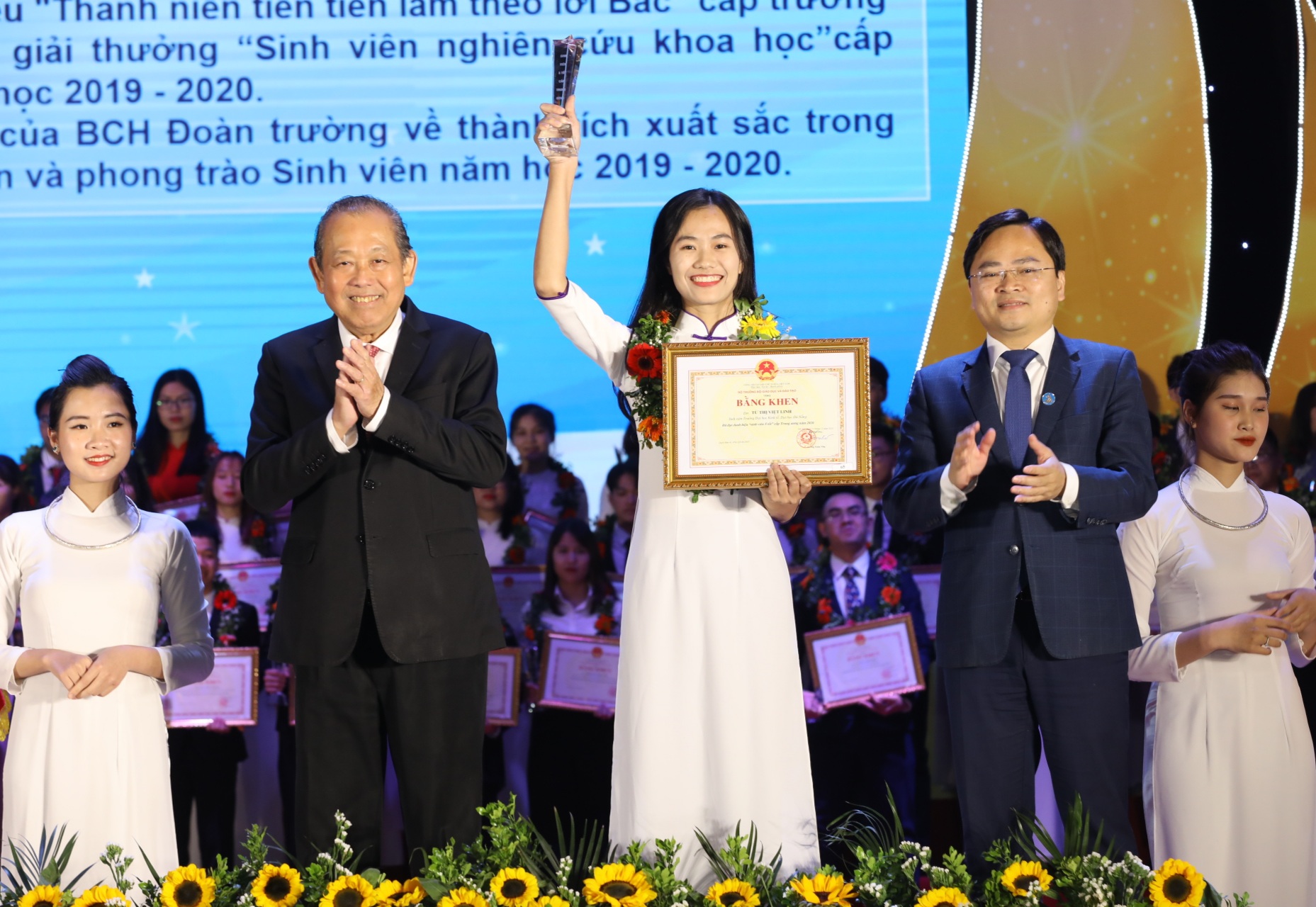 Đồng chí Nguyễn Đắc Vinh, Ủy viên TƯ Đảng, Phó Chánh Văn phòng TƯ Đảng (bìa trái); đồng chí Bùi Quang Huy, Bí thư Thường trực TƯ Đoàn, Chủ tịch Hội sinh viên Việt Nam tặng Bằng khen và Biểu trưng cho sinh viên danh hiệu Sinh viên 5 tốt cấp T.Ư.