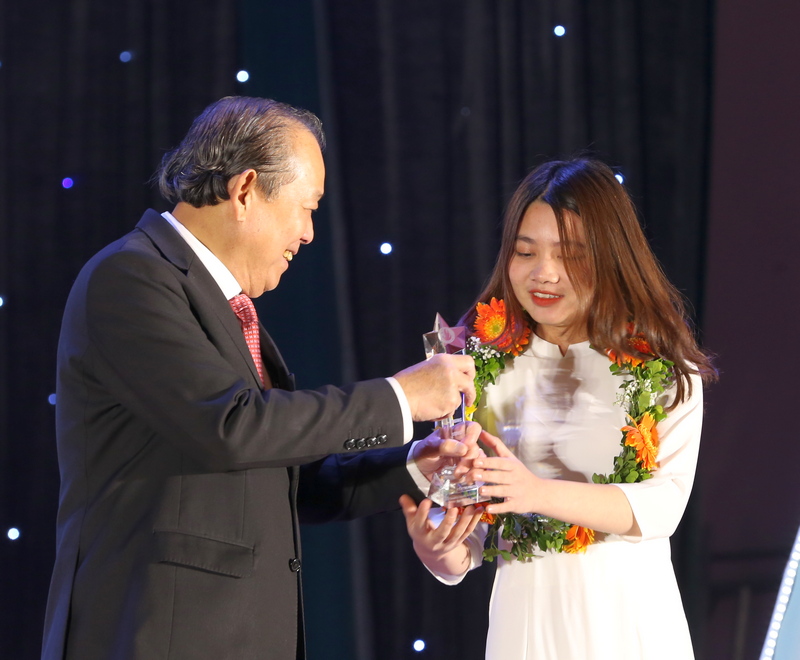 Đồng chí Nguyễn Anh Tuấn, Bí thư thứ nhất T.Ư Đoàn, Chủ tịch T.Ư Hội LHTN Việt Nam (bìa phải) tặng Bằng khen và Biểu trưng cho sinh viên nhận Giải thưởng Sao Tháng Giêng năm 2020.