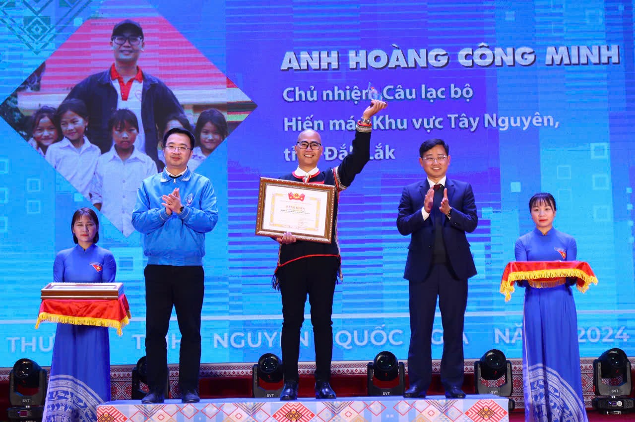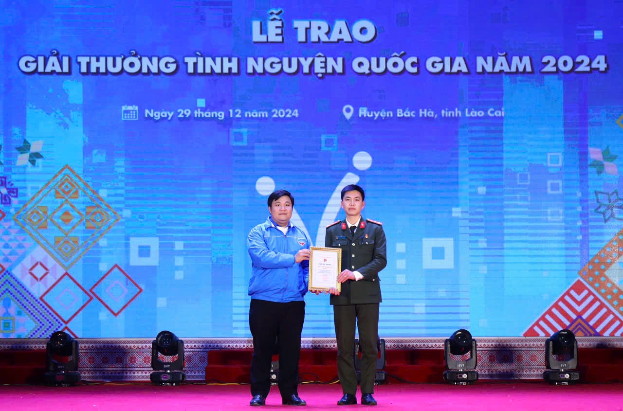 Đồng chí Nguyễn Tường Lâm, Bí thư Trung ương Đoàn, Chủ tịch Trung ương Hội LHTN Việt Nam (áo xanh) trao Bằng khen cho cá nhân có thành tích xuất sắc tiêu biểu trong hoạt động tình nguyện 2024