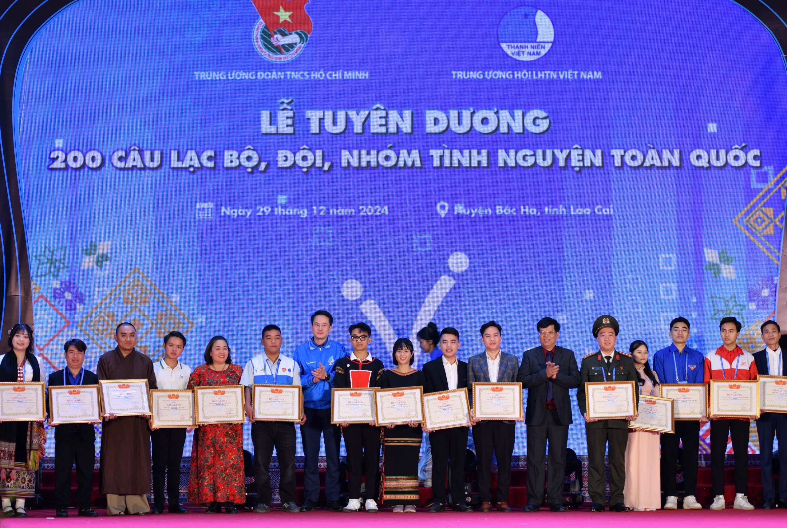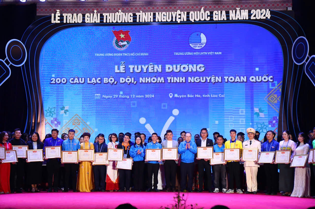 Đồng chí Nguyễn Kim Quy, Phó Chủ tịch thường trực Trung ương Hội LHTN Việt Nam (áo khoác xanh) trao Bằng khen cho 200 Câu lạc bộ, đội, nhóm có thành tích xuất sắc tiêu biểu trong hoạt động tình nguyện 2024.
