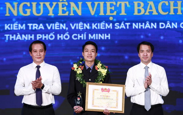 Đồng chí Trần Hữu, Trưởng ban Thanh niên công nhân và đô thị TƯ Đoàn (bìa phải) trao Bằng khen tặng cán bộ, công chức, viên chức trẻ giỏi 2022