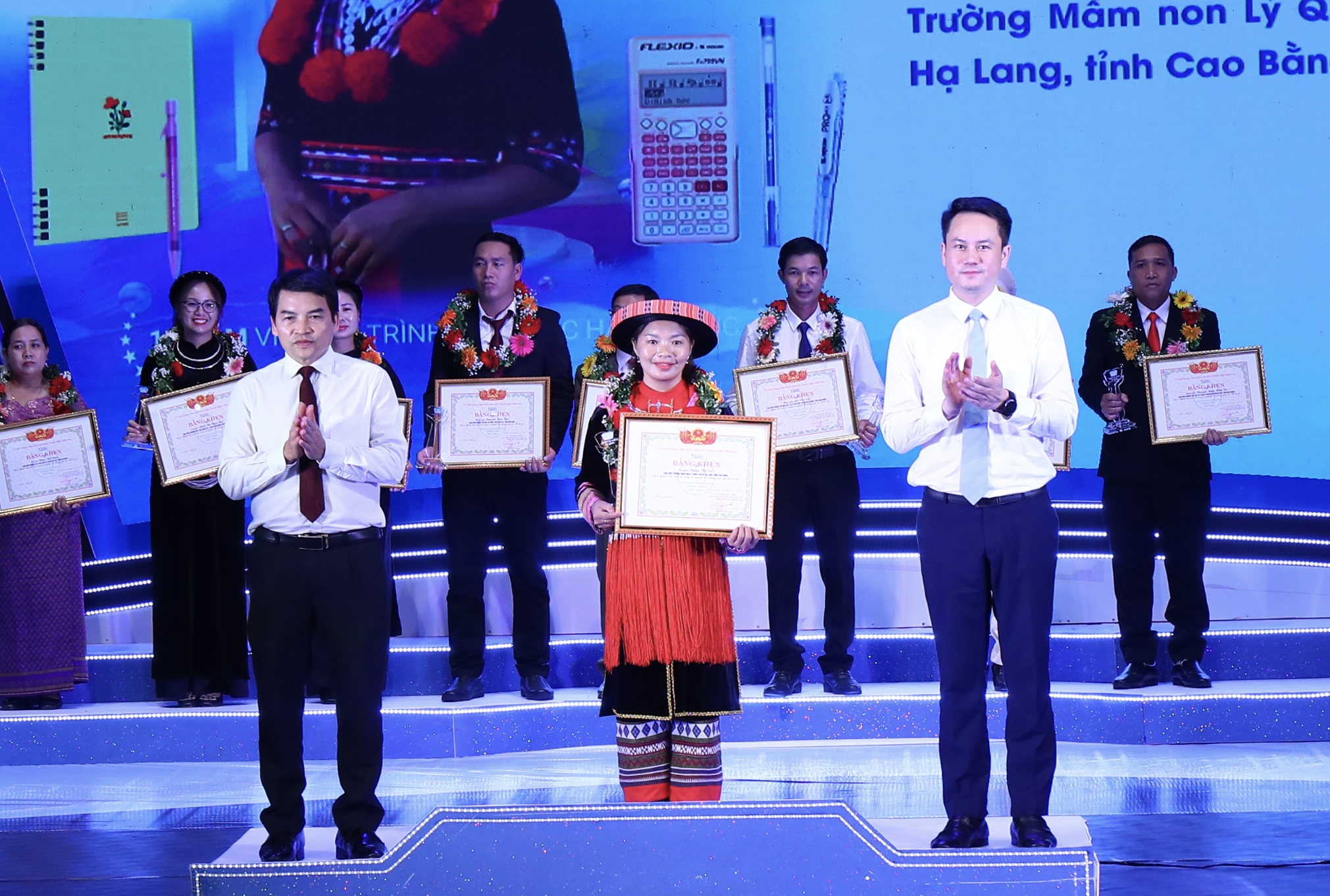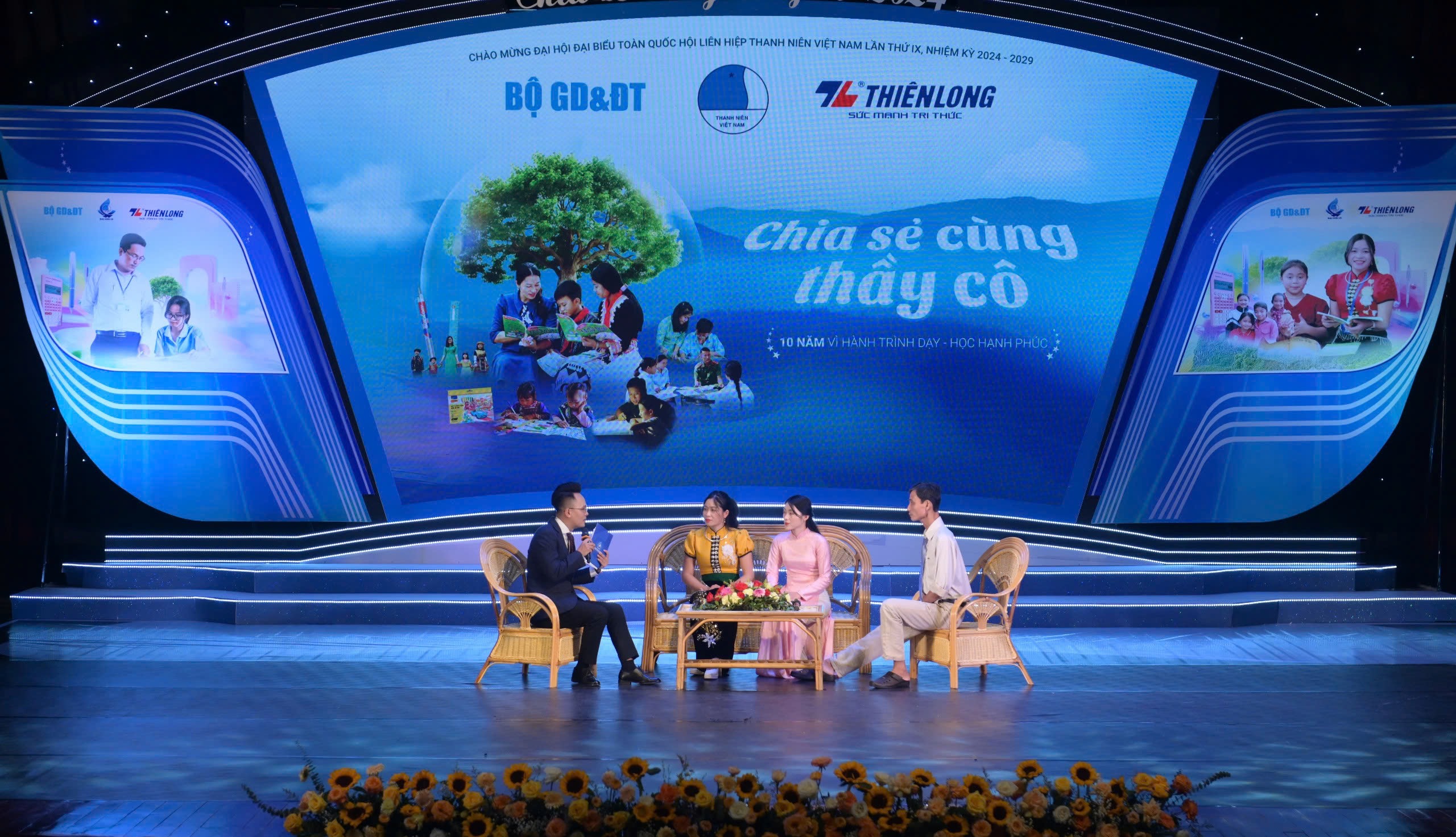 Đồng chí Nguyễn Tường Lâm, Bí thư Trung ương Đoàn, Phó Chủ tịch Trung ương Hội Liên hiệp Thanh niên Việt Nam và Ông Trần Mạnh Hào, Phó tổng Giám đốc Tập đoàn Thiên Long trao Bằng khen và kỷ niệm chương của chương trình dành cho những nỗ lực không ngừng nghỉ của các thầy cô giáo