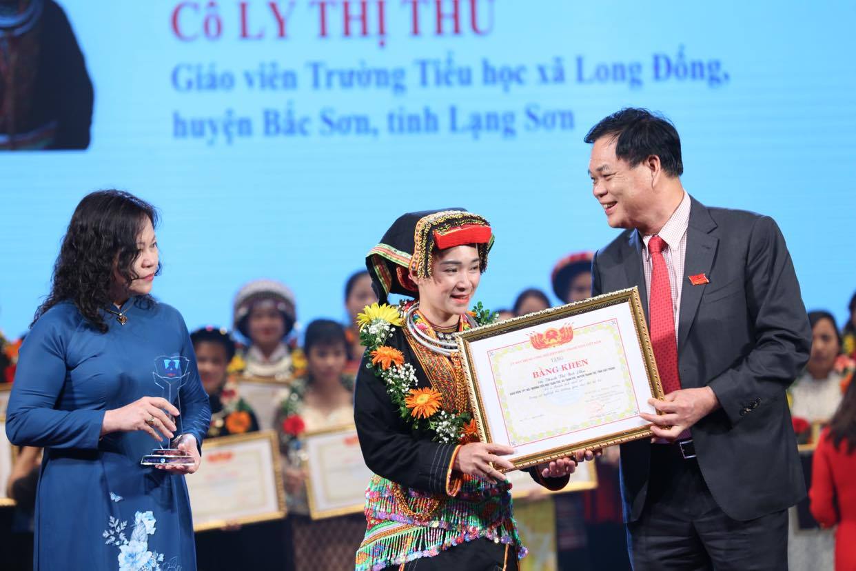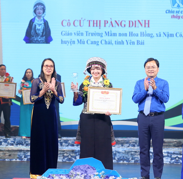 Thứ trưởng, Phó Chủ nhiệm UBDT Hoàng Thị Hạnh và đồng chí Nguyễn Anh Tuấn, Bí thư thứ nhất TƯ Đoàn, Chủ tịch Hội LHTN Việt Nam trao Bằng khen và biểu trưng của Ủy Ban TƯ Hội LHTN Việt Nam cho thầy cô giáo đã có thành tích xuất sắc trong sự nghiệp bồi dưỡng giáo dục thế hệ trẻ