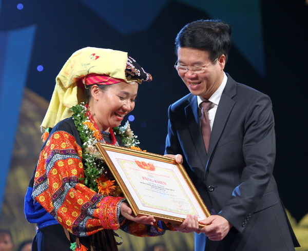 Đồng chí Võ Văn Thưởng, Ủy viên Bộ Chính trị, Bí thư Trung ương Đảng, Trưởng Ban Tuyên giáo TƯ trao Bằng khen cho thầy cô giáo người dân tộc thiểu số tại lễ tuyên dương