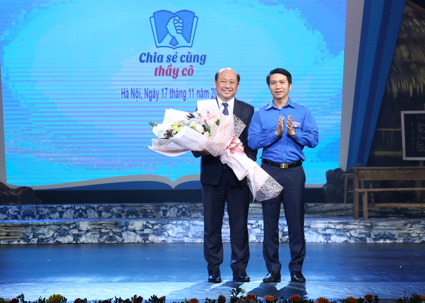 Bí thư T.Ư Đoàn, Chủ tịch Hội đồng Đội Trung ương Nguyễn Ngọc Lương tặng hoa Tập đoàn Thiên Long đồng hành trong chương trình Chia sẻ cùng thầy cô giáo