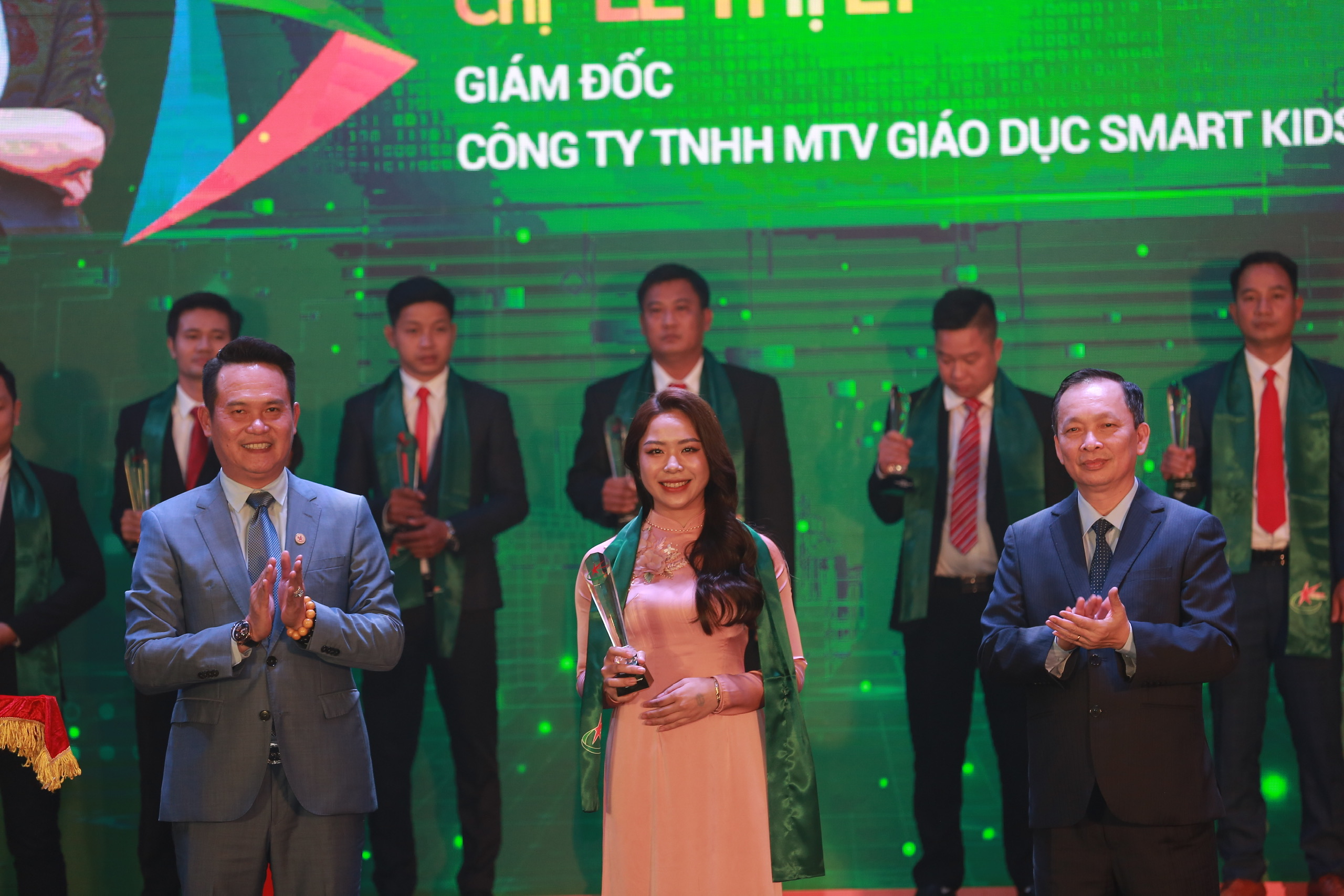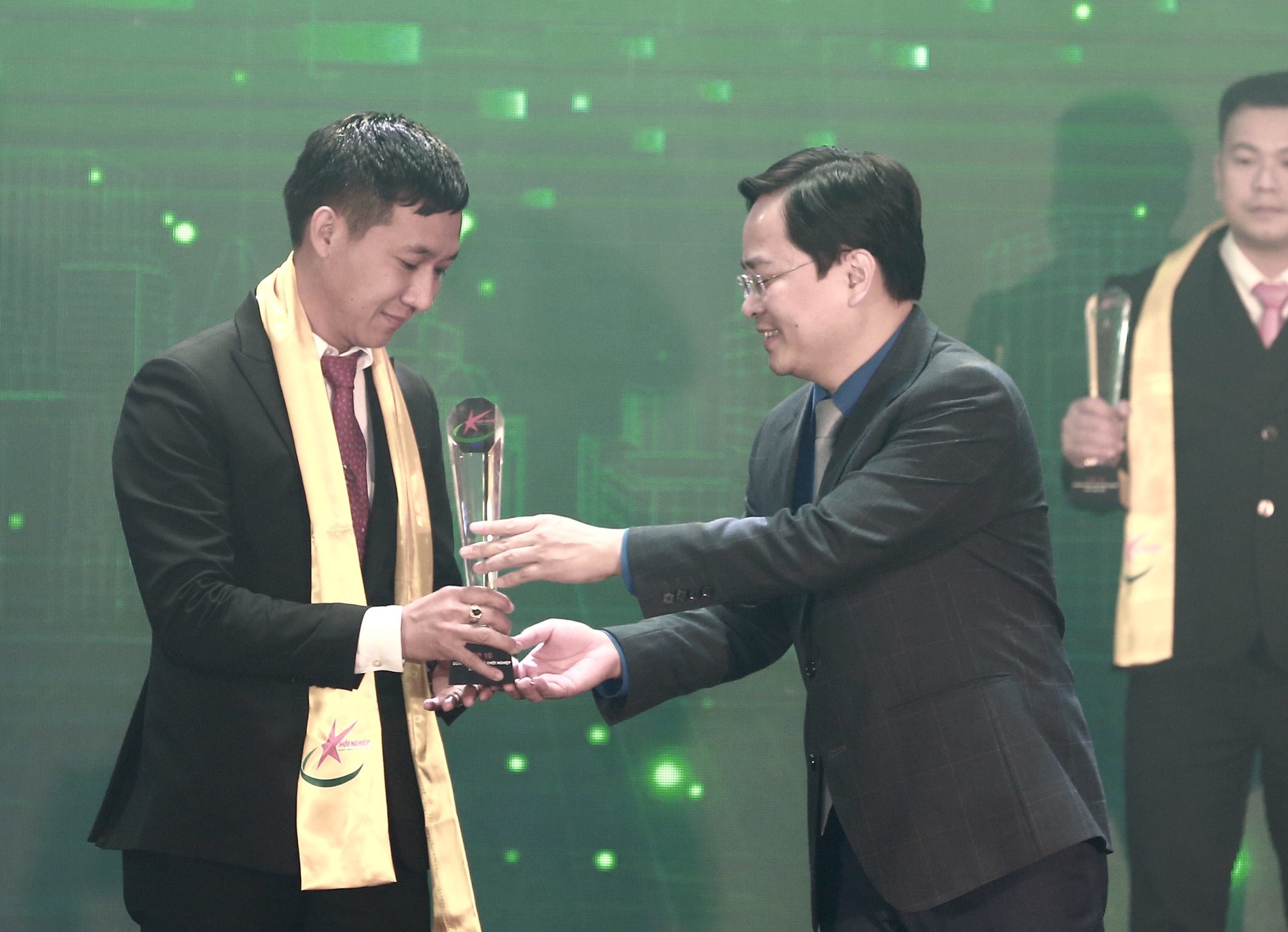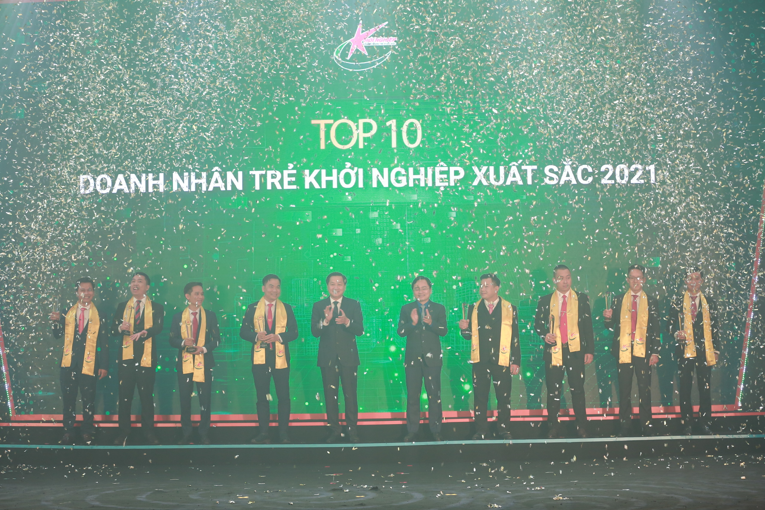 Phó Thủ tướng Chính phủ Lê Minh Khái và Bí thư thứ nhất TƯ Đoàn Nguyễn Anh Tuấn trao cho TOP 10 Doanh nhân trẻ Khởi nghiệp xuất sắc 2021