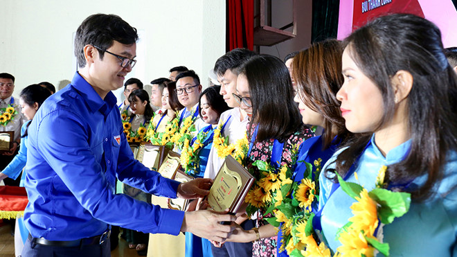 Đồng chí Nguyễn Ngọc Việt, Ủy viên Ban Thường vụ Trung ương Đoàn, Thành uỷ viên, Bí thư Thành đoàn Hà Nội trao tặng giấy khen các đảng viên trẻ Thủ đô tiêu biểu