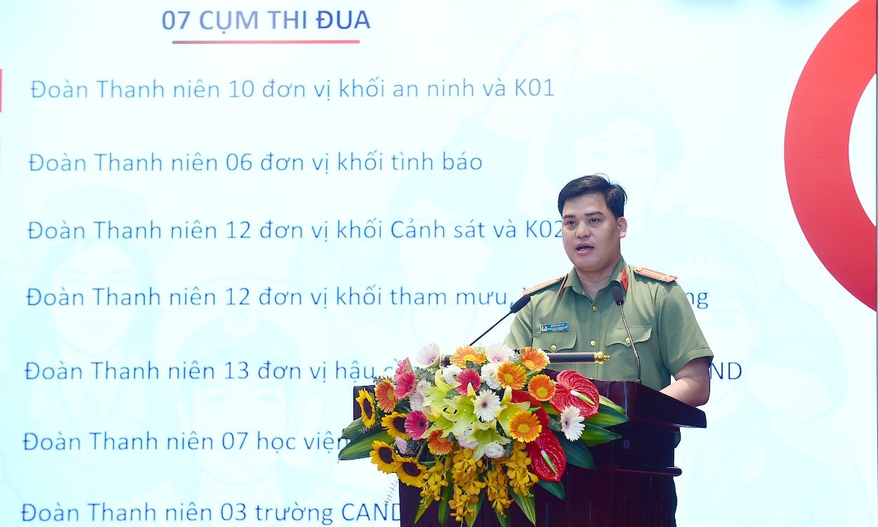 Trung tá Đồng Đức Vũ - Trưởng ban Thanh niên CAND báo cáo tóm tắt kết quả phong trào thi đua “Thanh niên CAND học tập, thực hiện Sáu điều Bác Hồ dạy”, giai đoạn 2019-2023