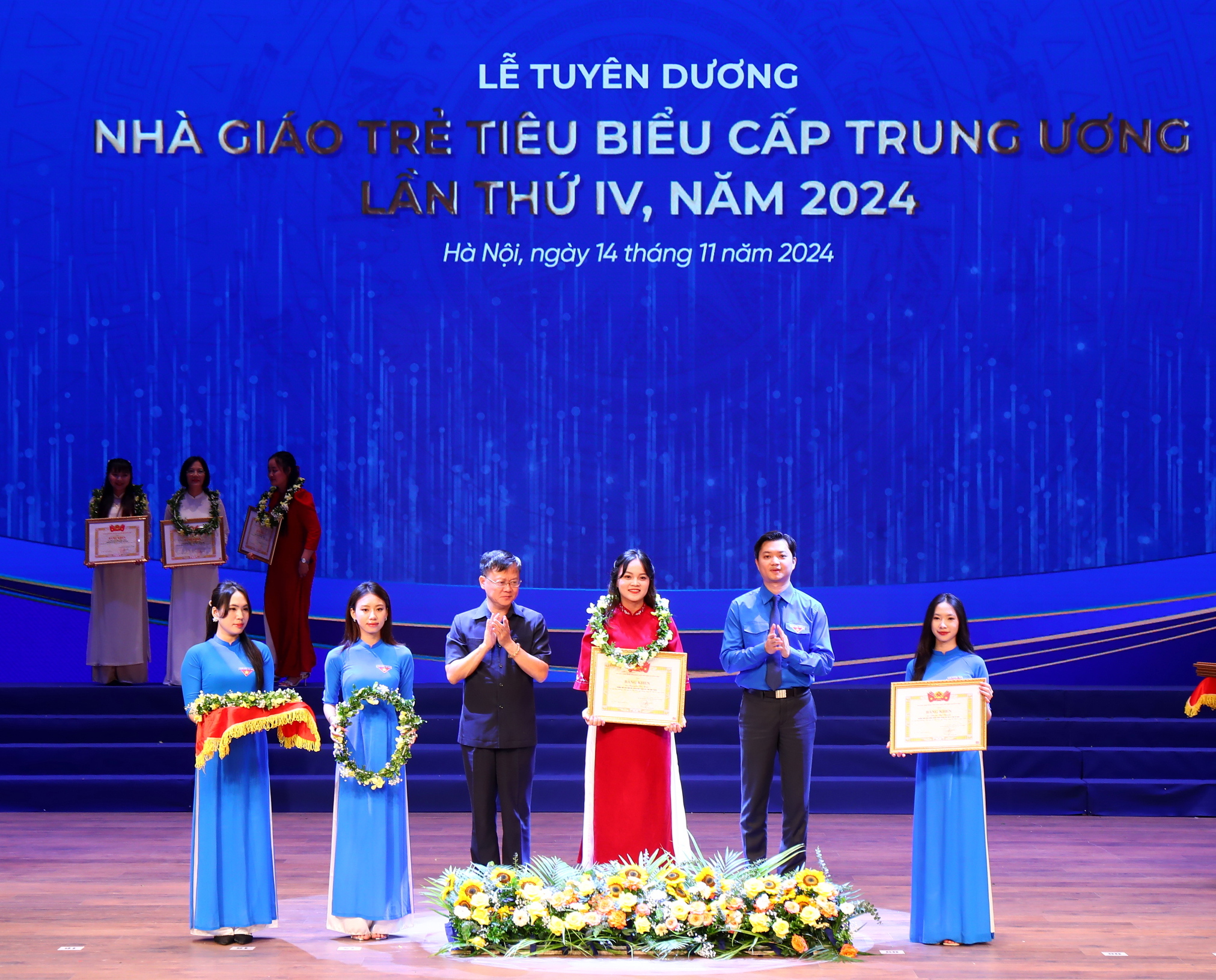 Đồng chí Lê Thành Long, Uỷ viên Trung ương Đảng, Phó Thủ tướng Chính phủ và đồng chí Bùi Quang Huy, Uỷ viên dự khuyết BCH Trung ương Đảng, Bí thư thứ nhất Trung ương Đoàn trao Bằng khen và hoa cho Nhà giáo trẻ tiêu biểu tại buổi lễ