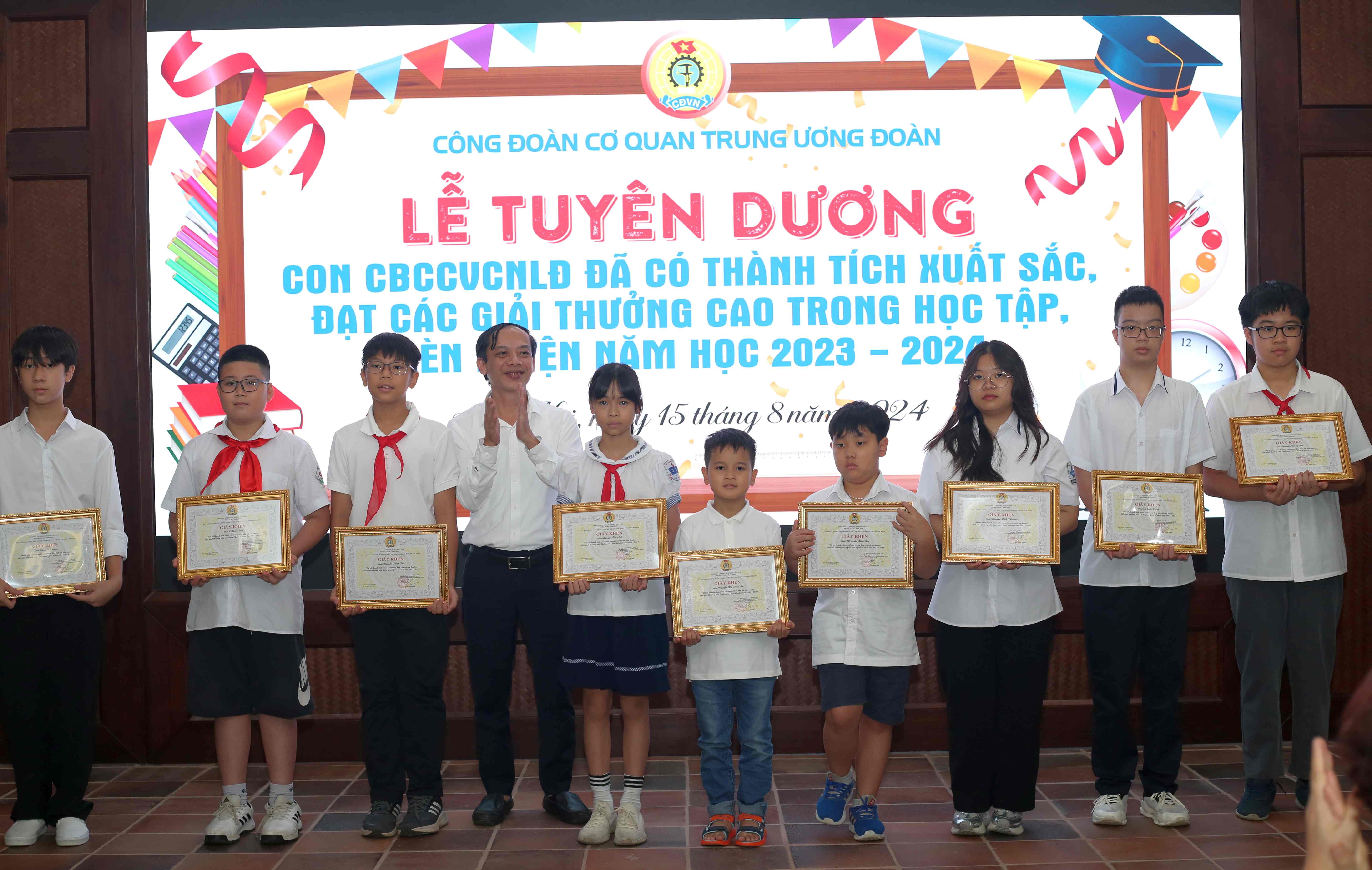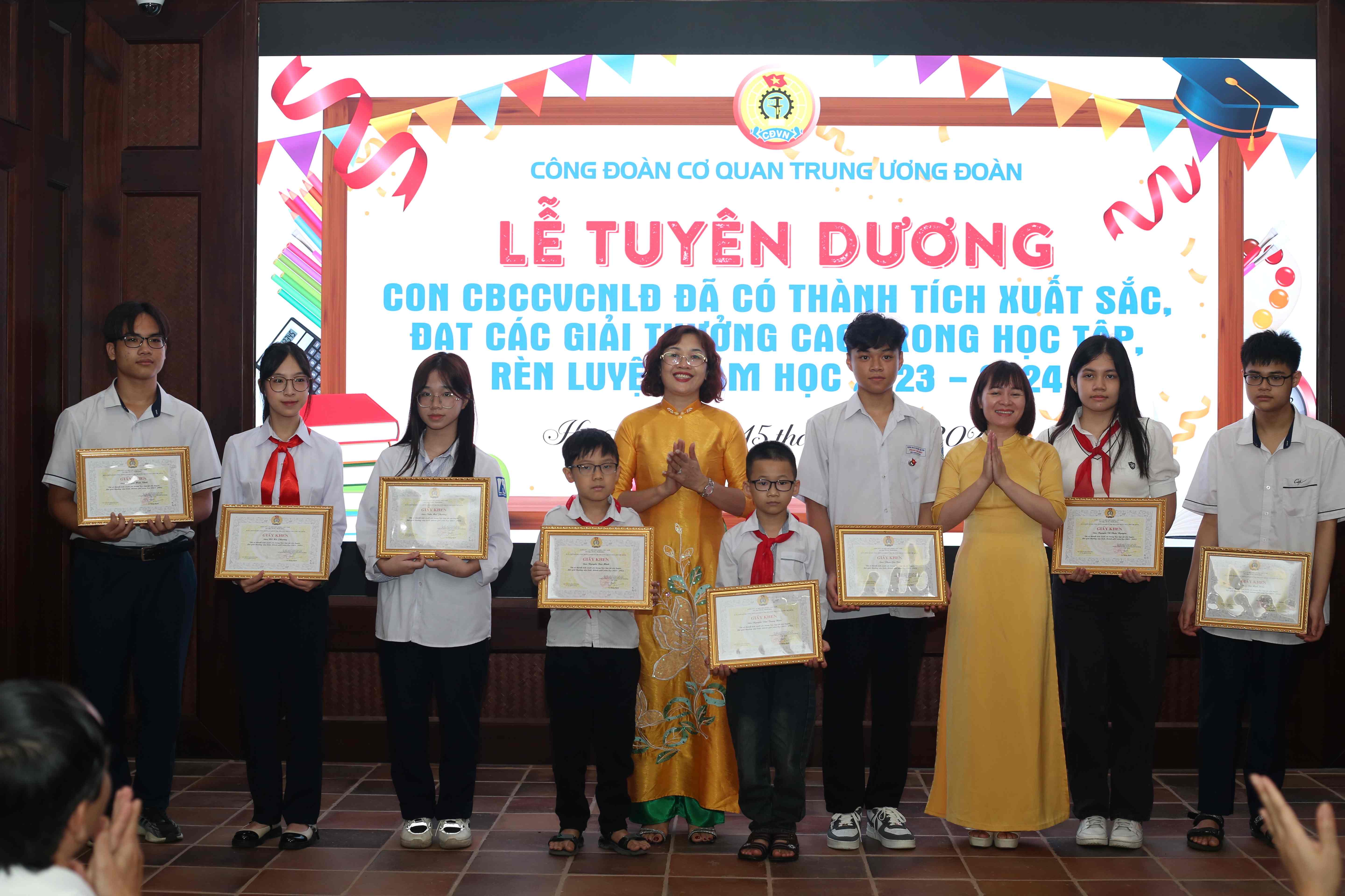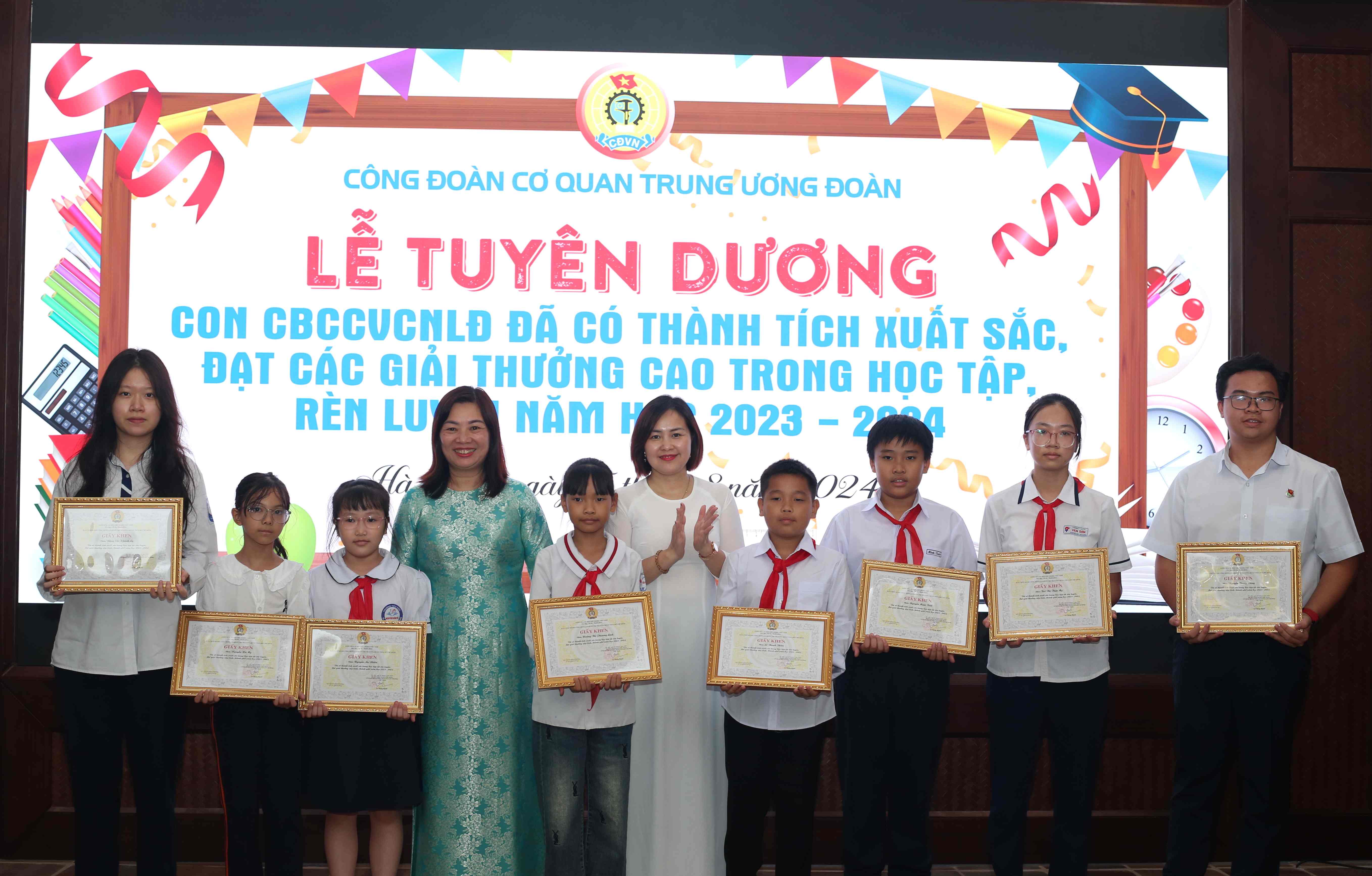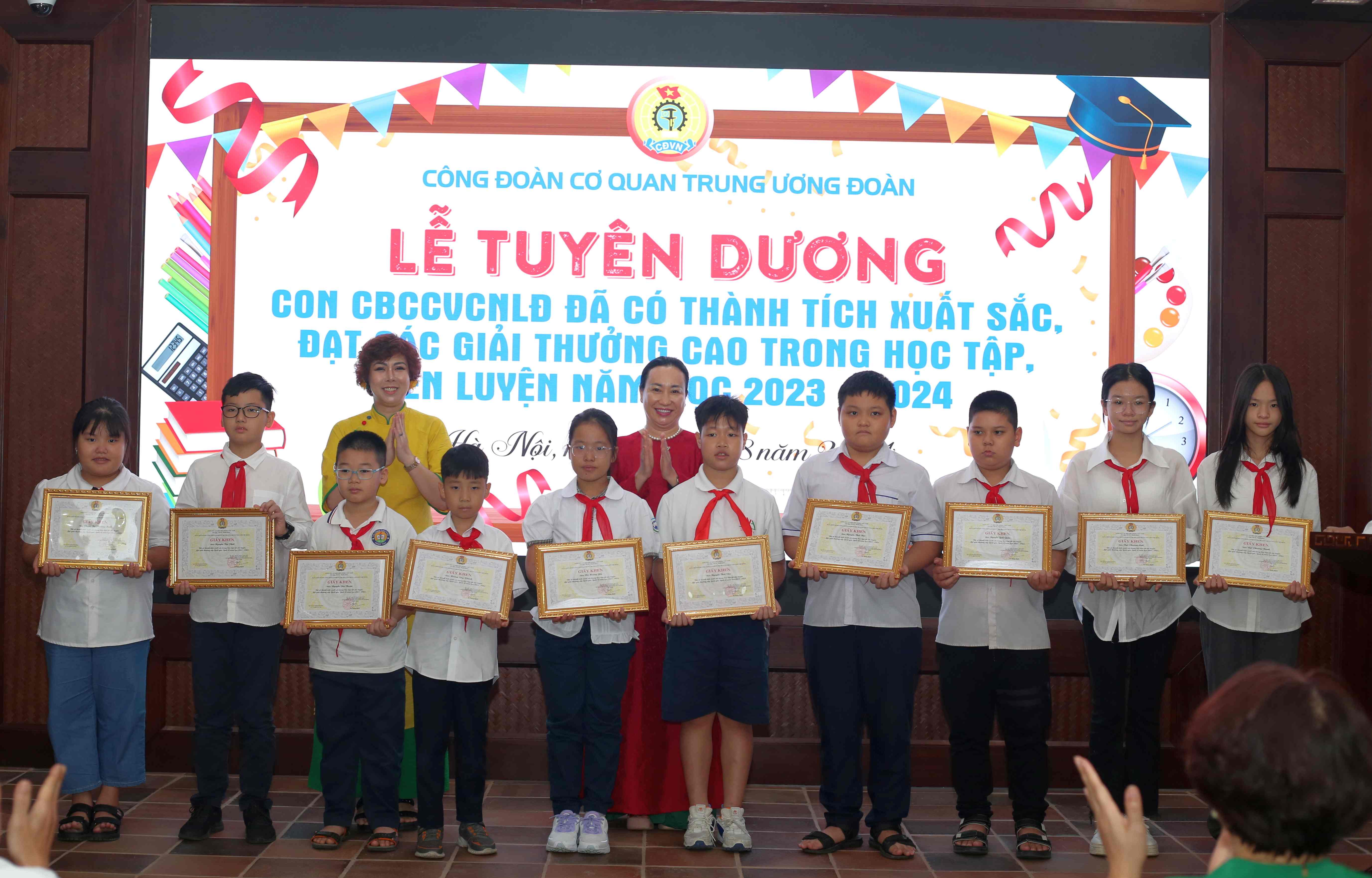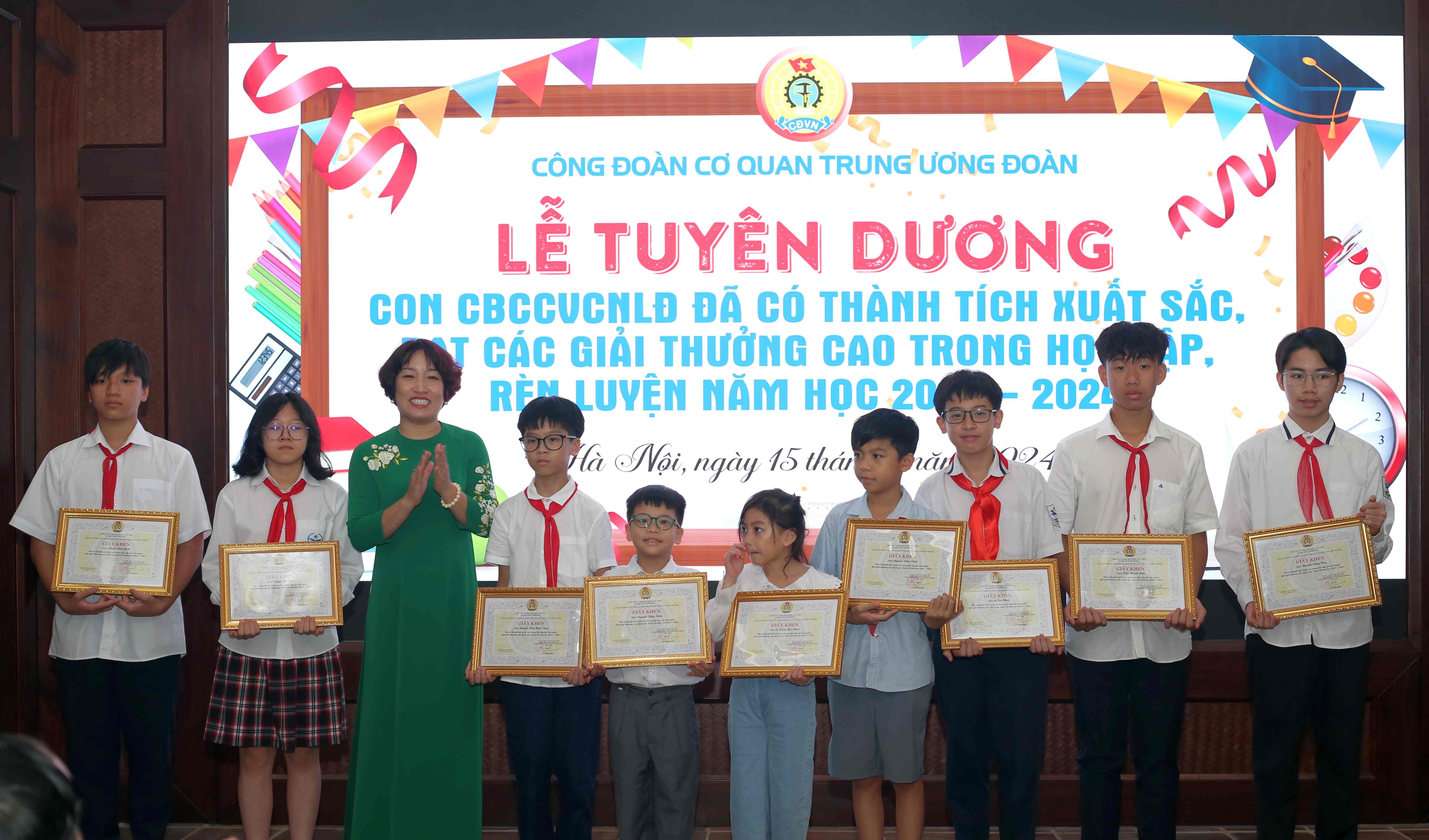 Tại lễ tuyên dương, Công đoàn cơ quan T.Ư Đoàn trao tặng giấy khen cho 76 học sinh có thành tích cao trong học tập, rèn luyện năm học 2023 - 2024 và đạt các giải thưởng cao trong các cuộc thi cấp tỉnh, thành phố và cấp quốc gia, quốc tế.