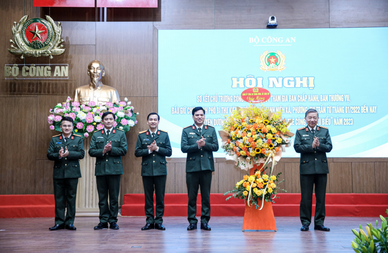Đại tướng Tô Lâm, Ủy viên Bộ Chính trị, Bí thư Đảng ủy Công an Trung ương, Bộ trưởng Bộ Công an và đồng chí Bùi Quang Huy, Ủy viên dự khuyết Trung ương Đảng, Bí thư thứ nhất Trung ương Đoàn trao giải thưởng cho 20 “Gương mặt trẻ Công an tiêu biểu” năm 2023