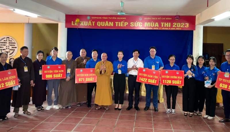 Đồng chí Dương Minh Nguyệt - Bí thư Tỉnh đoàn cùng các đồng chí lãnh đạo, Giáo hội phật giáo tỉnh trao tặng biển tượng trưng hỗ trợ các suất cơm tiếp sức mùa thi