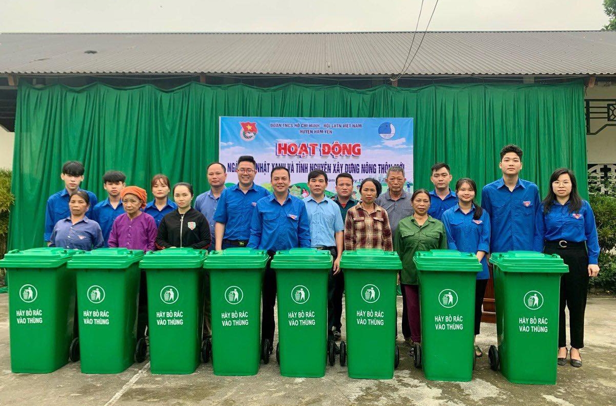 Đồng chí Hoàng Trần Trung - Phó Bí thư Tỉnh đoàn trao tặng trên 100 thùng rác xanh tại huyện Hàm Yên