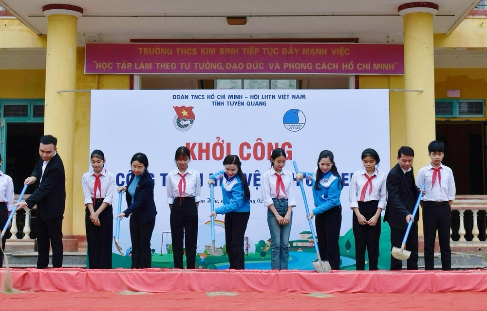 Các đại biểu thực hiện nghi thức khởi công xây dựng “Nhà vệ sinh cho em” tại trường THCS Kim Bình, xã Kim Bình, huyện Chiêm Hóa