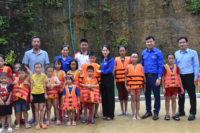 Các đồng chí đại biểu tặng áo phao cho các em học sinh