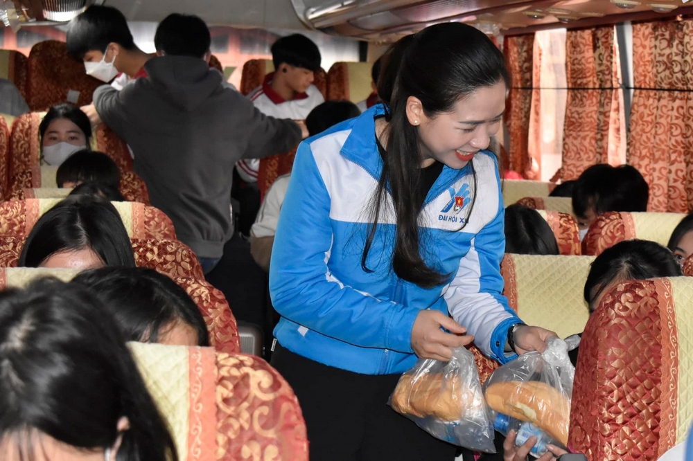Đồng chí Dương Minh Nguyệt – Bí thư Tỉnh đoàn trao các suất ăn cho học sinh về quê đón Tết