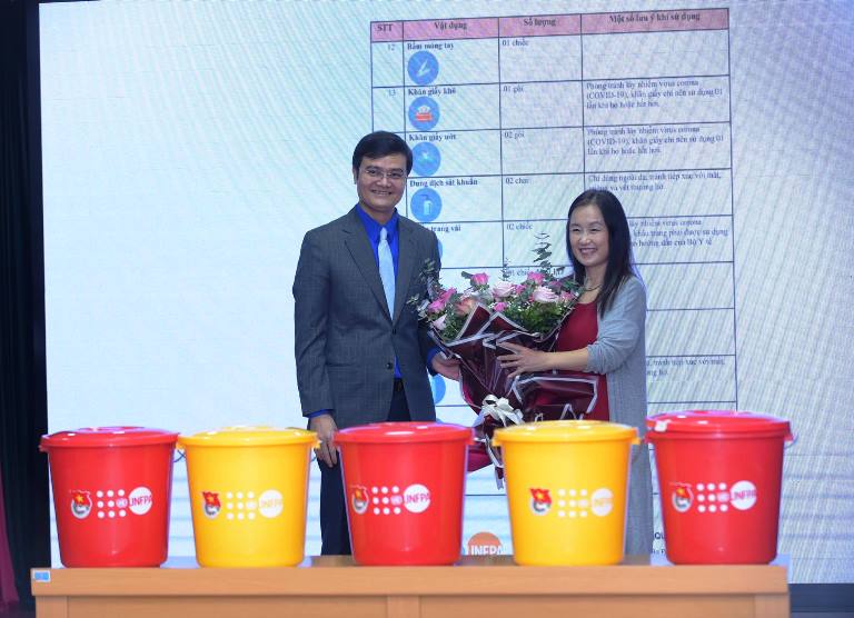 Bà Naomi Kitahara, Trưởng đại diện Quỹ Dân số Liên Hợp Quốc (UNFPA) tại Việt Nam bàn giao 3.704 bộ đồ dùng thiết yếu trị giá 180.000 USD cho đồng chí Bùi Quang Huy, Bí thư Thường trực Trung ương, Chủ tịch Hội Sinh viên Việt Nam