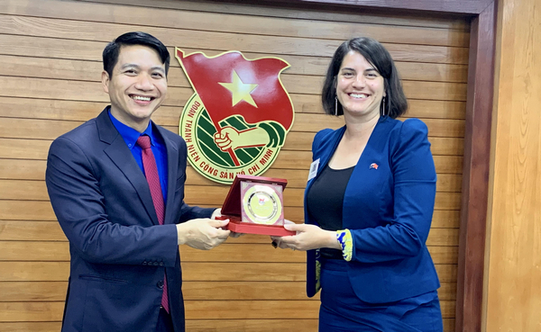 Đồng chí Nguyễn Ngọc Lương - Bí thư Trung ương Đoàn, Phó Chủ nhiệm thường trực UBQG về thanh niên Việt Nam trao tặng biểu trưng Đoàn TNCS Hồ Chí Minh cho bà Laura Fraser Hardy