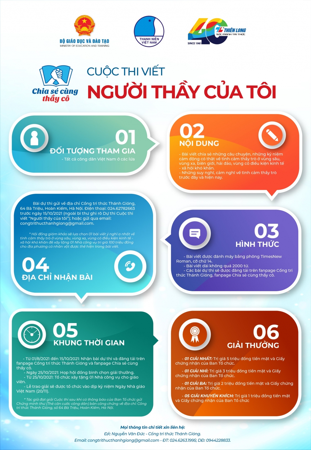 Bài dự thi gửi về địa chỉ Cổng tri thức Thánh Gióng, 64 Bà Triệu, Hoàn Kiếm, Hà Nội, điện thoại: 024.62782663 trước ngày 15/10/2021 (ngoài bì thư ghi rõ “Dự thi cuộc thi viết “Người thầy của tôi”) hoặc gửi qua email: congtrithucthanhgiong@gmail.com.
