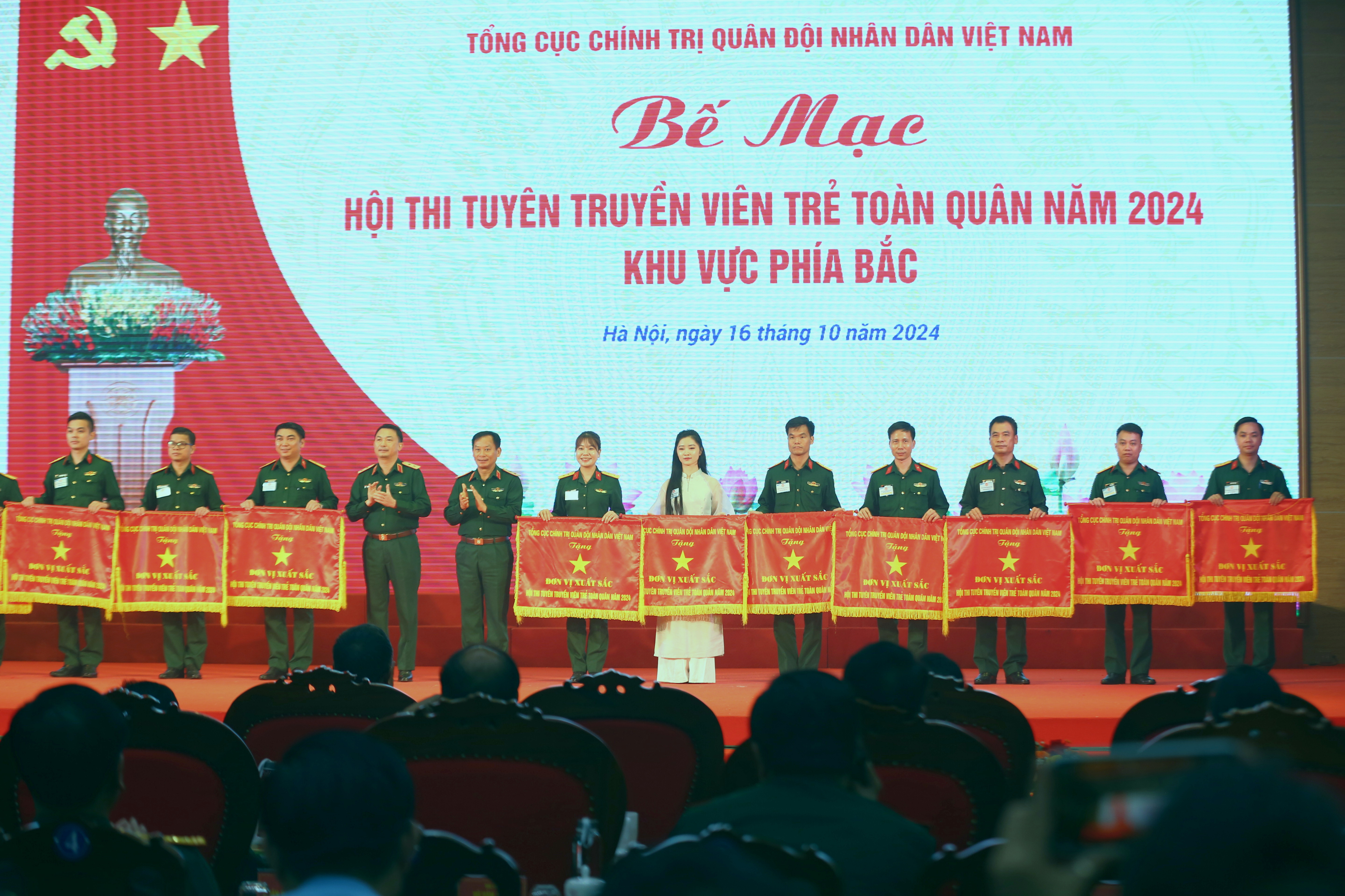 Trung tướng Lê Quang Minh, Phó Chủ nhiệm Tổng cục Chính trị Quân đội nhân dân Việt Nam và Bí thư Trung ương Đoàn Nguyễn Phạm Duy Trang, trao Cờ tặng các đội thi xuất sắc.
