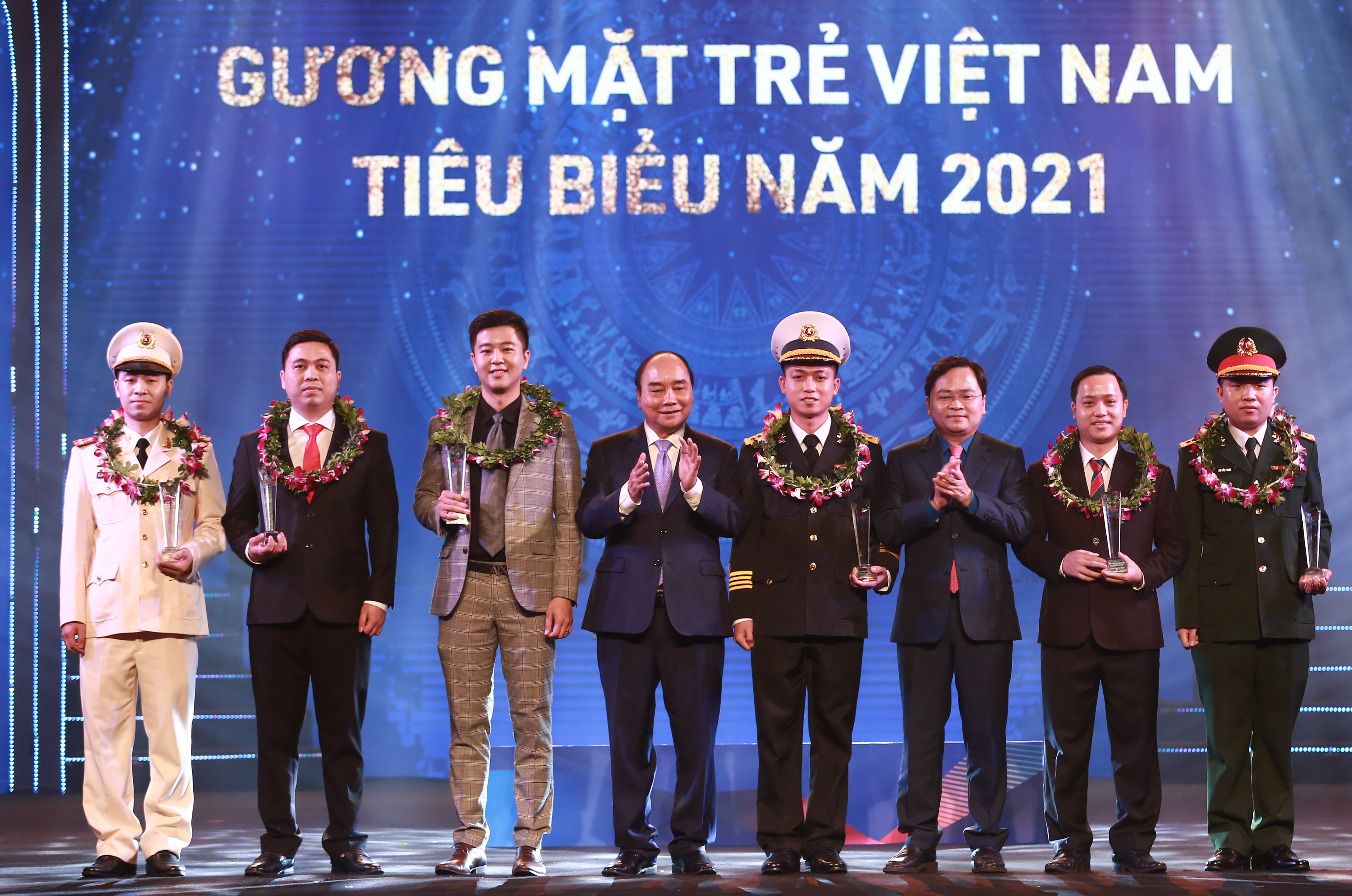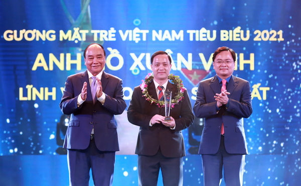 Chủ tịch nước Nguyễn Xuân Phúc và Bí thư thứ thứ nhất TƯ Đoàn Nguyễn Anh Tuấn trao giải thưởng 10 Gương mặt trẻ Việt Nam tiêu biểu năm 2021