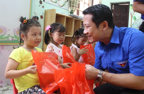 Đ/c Khổng Sơn Thành – Phó Bí thư Tỉnh đoàn trao tặng quà cho các em học sinh tại trường Mầm non Hướng Đạo, xã Hướng Đạo, huyện Tam Dương
