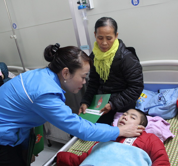 Đ/c Đỗ Thị Thanh Hương - Bí thư Tỉnh đoàn trào quà tết cho các em thiếu nhi có hoàn cảnh khó khăn đang điều trị tại Bệnh viện Sản nhi tỉnh.