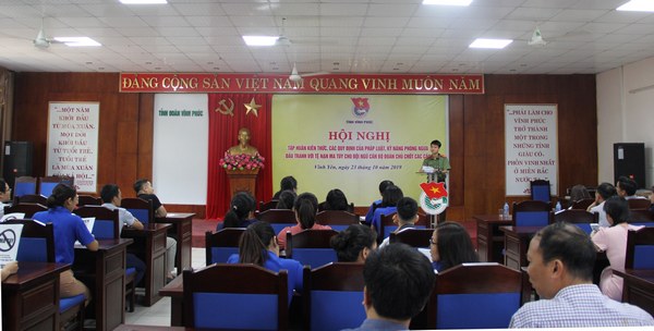 Tại Hội nghị các đại biểu đã được nghe đồng chí báo cáo viên Công an tỉnh thông tin về tình hình tội phạm, tội phạm ma túy trong 9 tháng đầu năm 2019, trên địa bàn tỉnh Vĩnh Phúc vẫn diễn biến phức tạp, đặc biệt trên các tuyến, địa bàn trọng điểm, cũng như kết quả trong công tác phối hợp của Đoàn thanh niên các cấp với các ngành chức năng trong chỉ đạo triển khai, thực hiện có hiệu quả hoạt động của các đội tuyên truyền về phòng, chống tội phạm, tệ nạn ma túy, phòng chống mua bán người trong toàn tỉnh. Đồng thời các báo cáo viên đã cập nhật các kiến thức, các quy định mới về công tác phòng chống ma túy; truyền tải những nội dung về thực trạng ma túy ở Việt Nam; cách nhận biết các loại ma túy, nhất là ma túy đá hiện nay; trang bị những kỹ năng phòng ngừa, đấu tranh với tệ nạn ma túy cho học viên; đồng thời chia sẻ quá trình triệt phá các vụ ma túy thành công trên địa bàn tỉnh những năm gần đây.