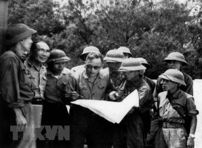 Đồng chí Võ Chí Công (thứ 2, từ trái sang) và Đại tướng Chu Huy Mân (đeo kính, thứ 4 từ trái sang-nguyên Tư lệnh Quân giải phóng Quân khu 5 trong kháng chiến chống Mỹ) trong chiến dịch giải phóng thành phố Đà Nẵng (3/1975). (Ảnh: TTXVN)