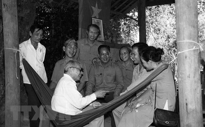 Chủ tịch Hội đồng Nhà nước Võ Chí Công nói chuyện thân mật với cán bộ huyện Tân Biên (Tây Ninh) ở lán làm việc của đồng chí Phạm Hùng trước đây trong Khu Trung ương Cục miền Nam, trong chuyến thăm tỉnh Tây Ninh từ ngày 18 đến 23/1/1990. (Ảnh: Minh Điền/TTXVN)