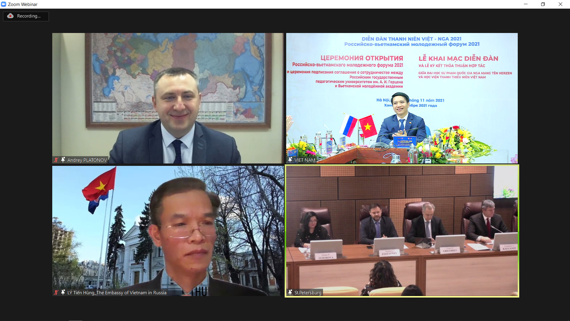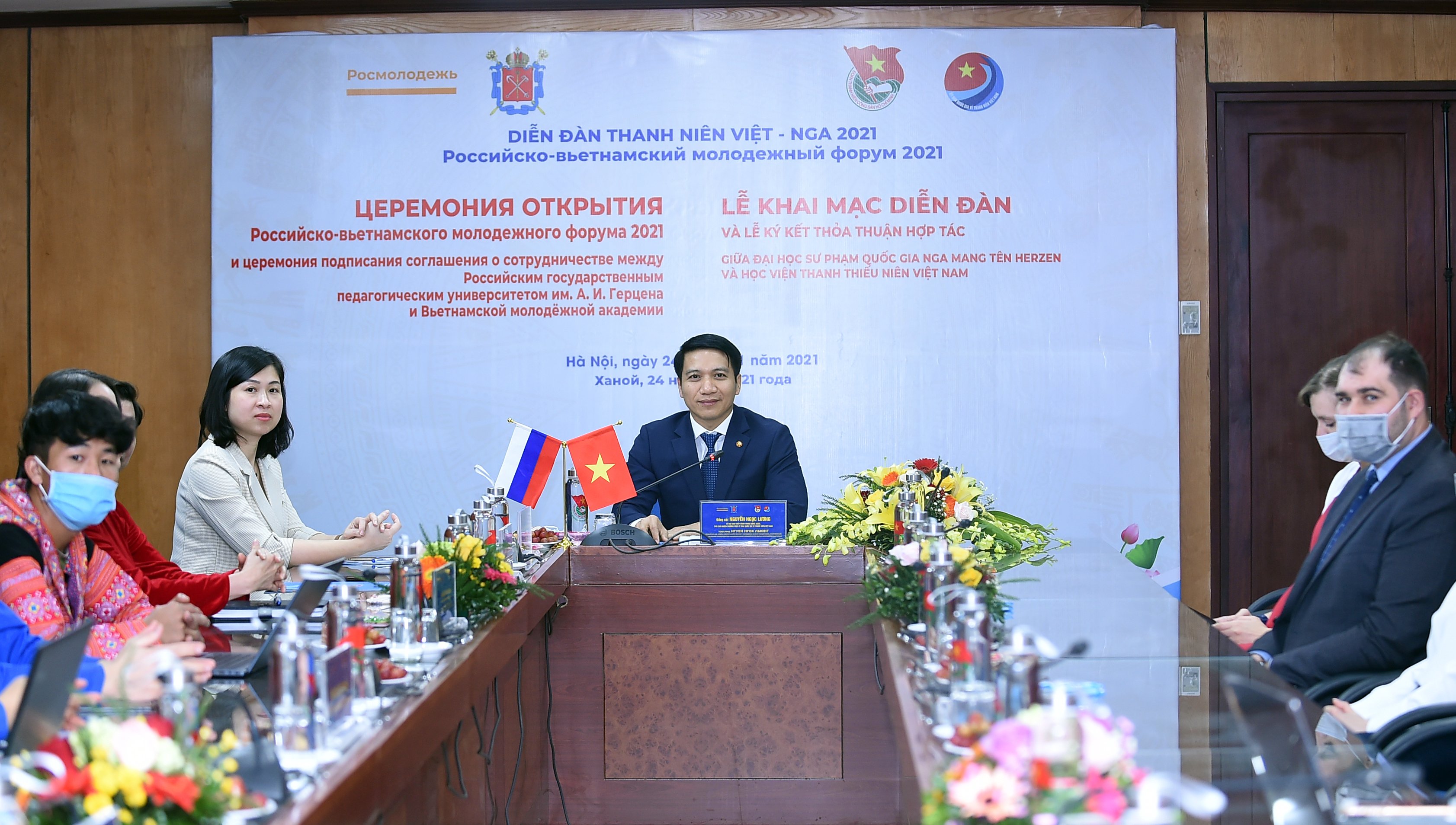 Trong khuôn khổ diễn đàn, diễn ra Lễ ký kết Thỏa thuận hợp tác giữa Học viện thanh thiếu niên Việt Nam và Đại học Sư phạm Quốc gia Nga mang tên Herzen theo hình thức trực tuyến. Đây là nội dung được hai bên thống nhất triển khai tại Diễn đàn Thanh niên Nga – Việt 2019 tổ chức từ ngày 24/9 – 01/10/2019 tại Liên bang Nga. Thỏa thuận gồm một số nội dung chính, cụ thể: Các hoạt động trao đổi giảng viên và sinh viên; các hoạt động đào tạo giáo dục bậc đại học, bằng chuyên tu, thạc sỹ; các chương trình tập huấn cho giới học thuật và cán bộ giảng dạy ở bậc sau đại học; các hội nghị, hội thảo, thảo luận bàn tròn liên quan đến giáo dục và công tác thanh niên; các chương trình nâng cao khả năng ngoại ngữ tiếng Nga.
