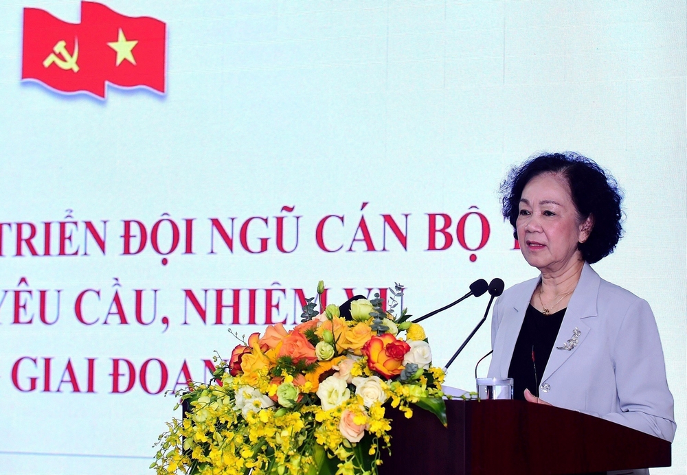 Đồng chí Trương Thị Mai, Ủy viên Bộ Chính trị, Thường trực Ban Bí thư Trung ương Đảng, Trưởng ban Tổ chức Trung ương phát biểu tại Tọa đàm