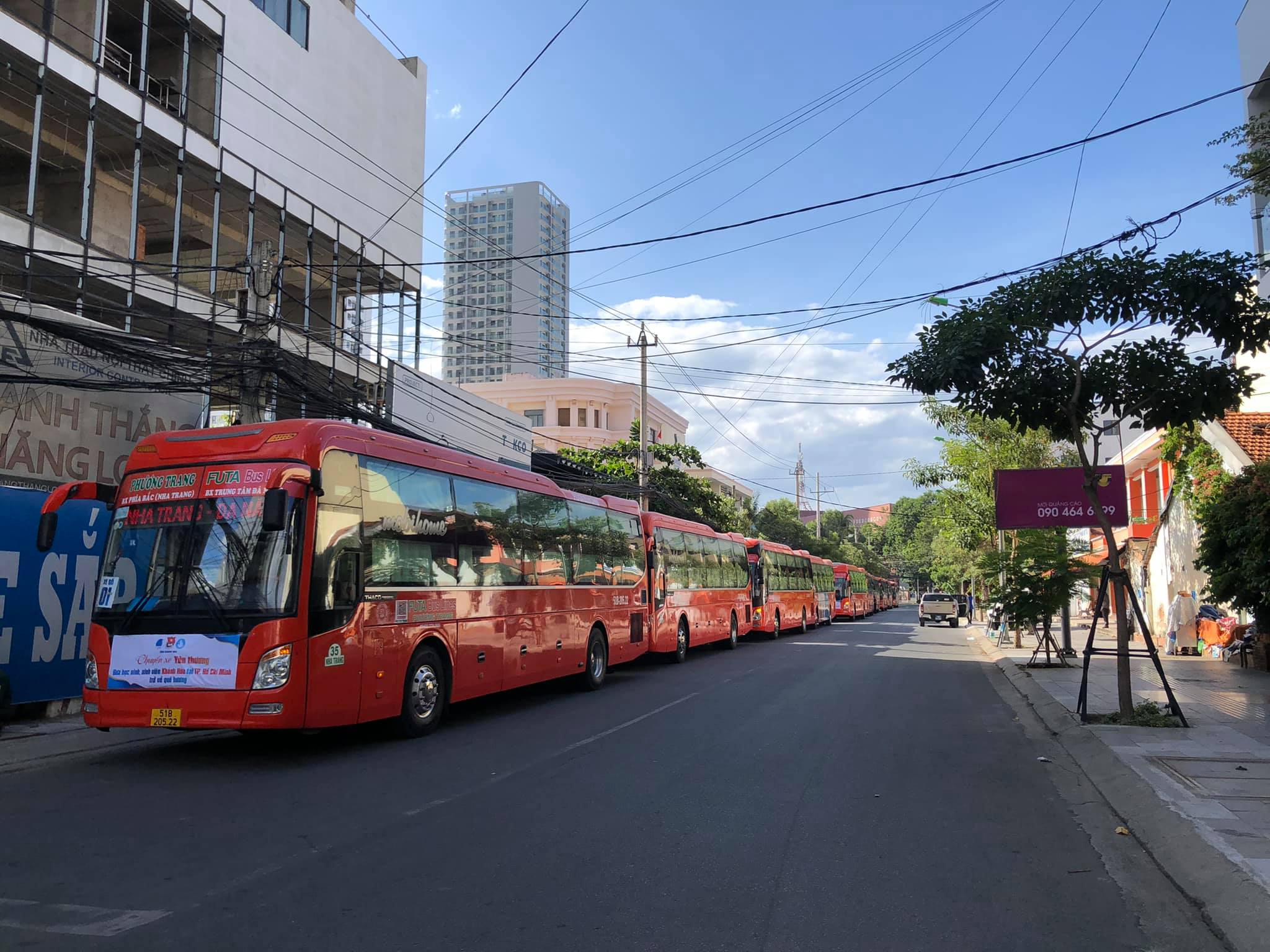 Những chiếc xe khách Phương Trang được xếp hàng thẳng tắp, với băng rôn khẩu hiệu, số thứ tự đoàn xe, đang nổ máy sẵn sàng chuẩn bị lên đường vào Thành phố Hồ Chí Minh đưa các em sinh viên Khánh Hòa đang học tập tại TP. Hồ Chí Minh trở về quê hương giữa đại dịch Covid-19 đang diễn biến rất phức tạp.