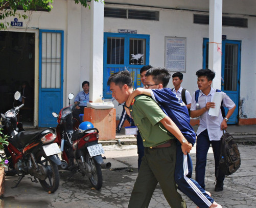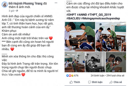 Những tấm ảnh ghi lại cảnh một chiến sĩ mặc sắc phục an ninh hỗ trợ một thí sinh mắc bệnh, không thể tự đi lại được. Từng tấm ảnh ghi lại khoảnh khắc người chiến sĩ này bỏ bút, thước vào cặp, đỡ thí sinh đứng dậy, cõng cậu ra vào phòng thi,… một cách rất cẩn thận. Cạnh đó, có một học sinh khác là thí sinh ngồi cạnh bàn của cậu cũng hỗ trợ rất nhiệt tình.