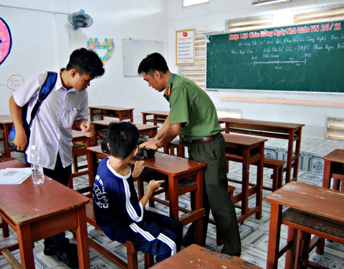 Nhân vật chính trong bức ảnh được xác minh là Đại úy Lữ Minh Trung, hiện đang công tác tại Đội An ninh – Công an TP.Bạc Liêu. Anh được điều động làm giám thị điểm thi 02, cụm 61 tại địa phương