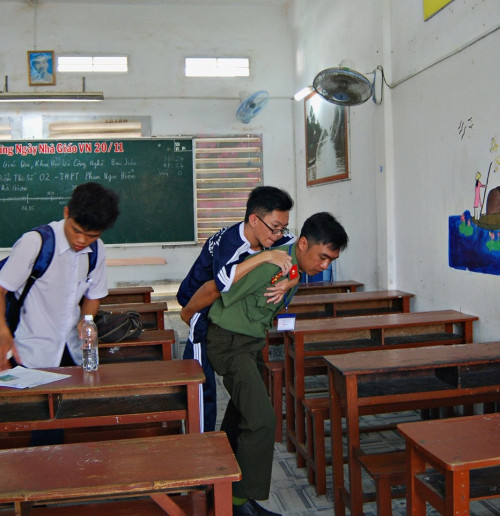 Đại úy Trung cõng Nghi ra về sau khi làm bài thi môn Ngữ Văn