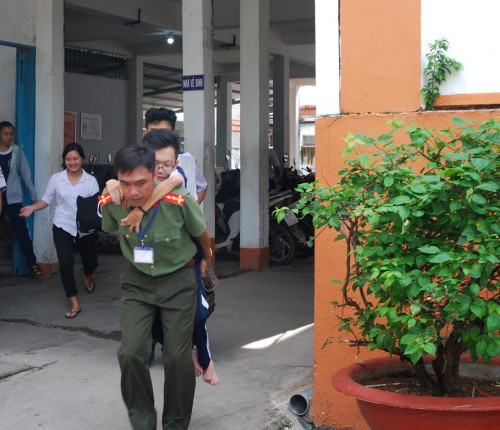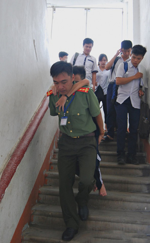 "Trong lúc tham gia hỗ trợ tại điểm thi này, mình vô tình thấy hình ảnh anh chiến sĩ cõng bạn học sinh sao đẹp quá, nên xin phép chụp ảnh lại. Anh vui vẻ đồng ý. Mẹ bạn ấy sau khi thuê taxi chở bạn ấy đến cổng trường thì không được phéo vào trong, nên anh liền đến cõng bạn vào tận phòng thi. Bạn bị mắc căn bệnh xương thủy tinh, nên anh phải rất cẩn thận trong việc dìu đỡ để không gây nguy hiểm. Cầu thang dẫn lên lầu 1, nơi bạn ấy thi, cũng khá cũ và dốc, làm anh khá khó khăn khi giúp bạn", Phương Trang cho biết.