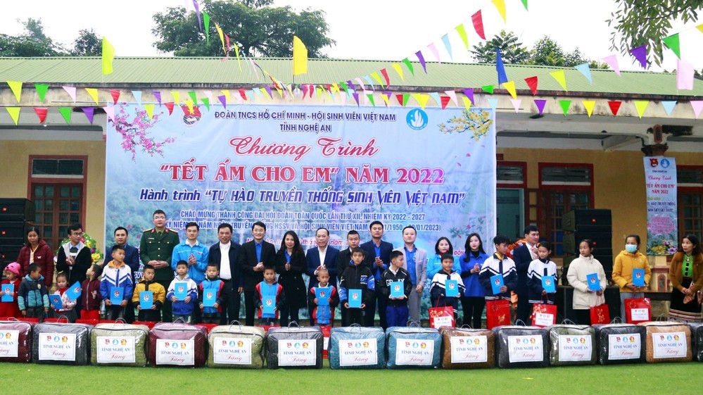 Đại diện Thường trực Tỉnh đoàn, Ban Thư ký Hội Sinh viên tỉnh và 9 đoàn trường đại học, cao đẳng trực thuộc Tỉnh đoàn đã trao tặng 20 suất quà, mỗi suất trị giá 600 nghìn đồng cho các em có hoàn cảnh khó khăn vươn lên học tốt. Cùng với đó, toàn bộ các em của trường còn được nhận áo ấm và các suất quà bánh kẹo ngay tại chương trình. Ảnh: Phương Thảo