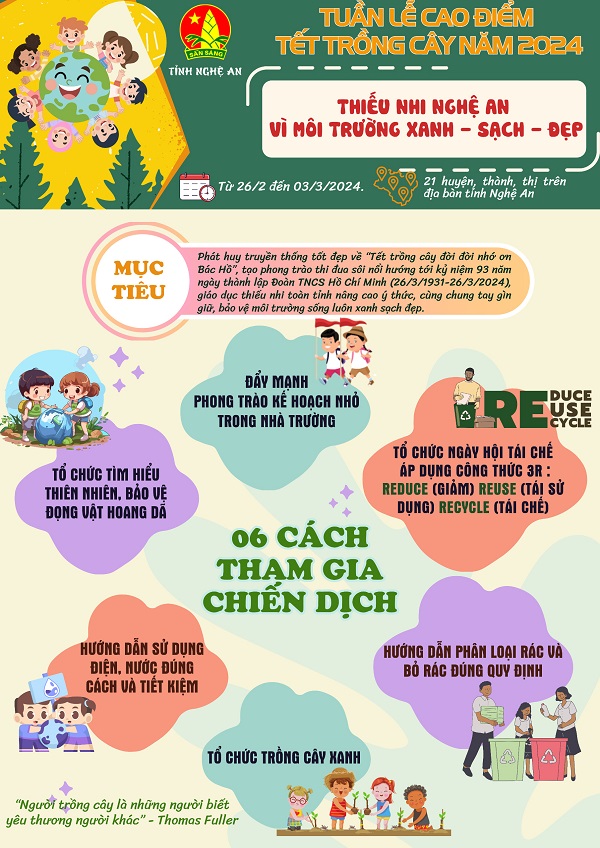 Bên cạnh đó, tại các liên đội trường học tại thành phố Vinh, các em thiếu niên nhi đồng tự tay ươm những cây xanh xây dựng vường cây xanh nghìn việc tốt.