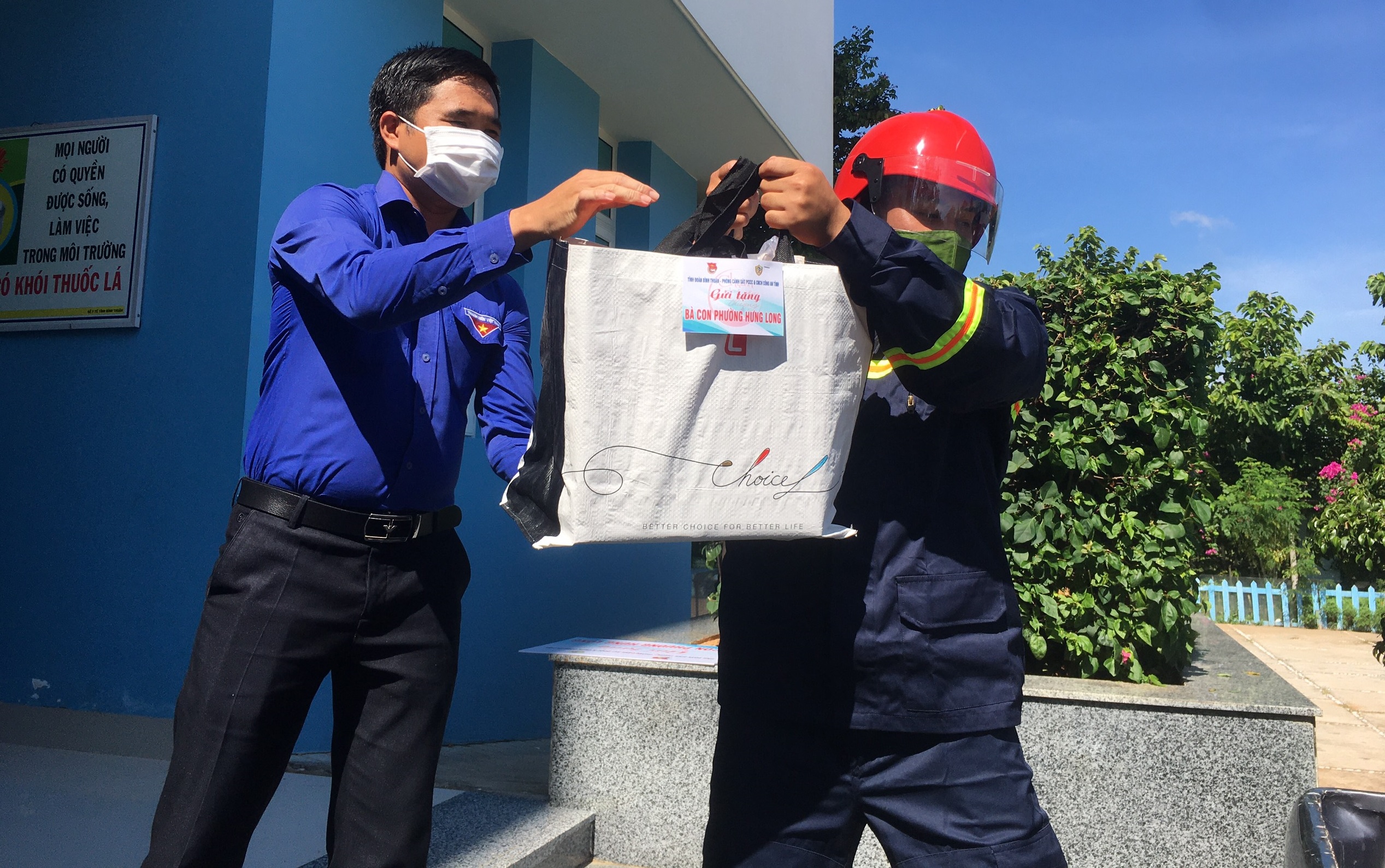 ĐTN: Trong khuôn khổ chương trình "Chạm những yêu thương", ngày 17/8/2021, Tỉnh đoàn Bình Thuận, Phòng Cảnh sát Phòng cháy chữa cháy và Cứu nạn cứu hộ Công an tỉnh tổ chức tặng 100 suất quà cho người dân có hoàn cảnh khó khăn tại khu phong tỏa phường Hưng Long, thành phố Phan Thiết.