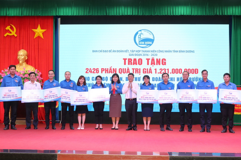 ĐTN: Ngày 25/01/2021, Ban chỉ đạo Đề án Đoàn kết tập hợp TNCN tỉnh Bình Dương đã trao tặng 2.426 suất quà Tết giá trị 1,213 tỷ đồng cho cán bộ thực hiện công tác đề án, bí thư, chi hội trưởng, chủ nhiệm Câu lạc bộ, Đội, Nhóm thanh niên công nhân.